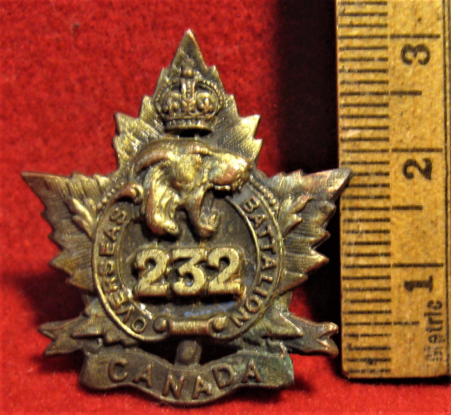 You are viewing a vintage CEF WWI era 232nd battalion collar badge. This badge is made of pickled brass. The lugs have been clipped by a previous owner. However the badge itself is an excellent example and displays well in collection.