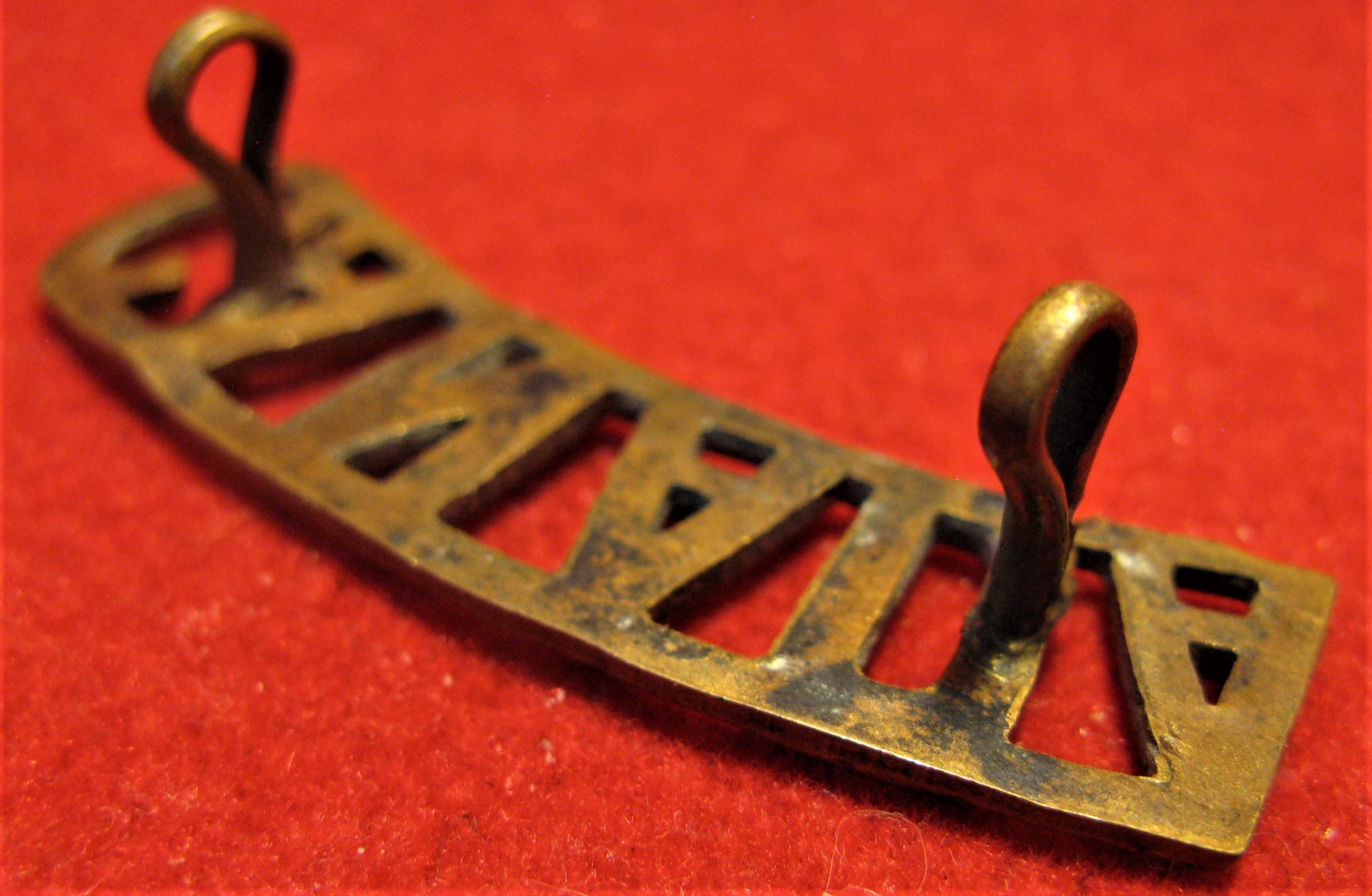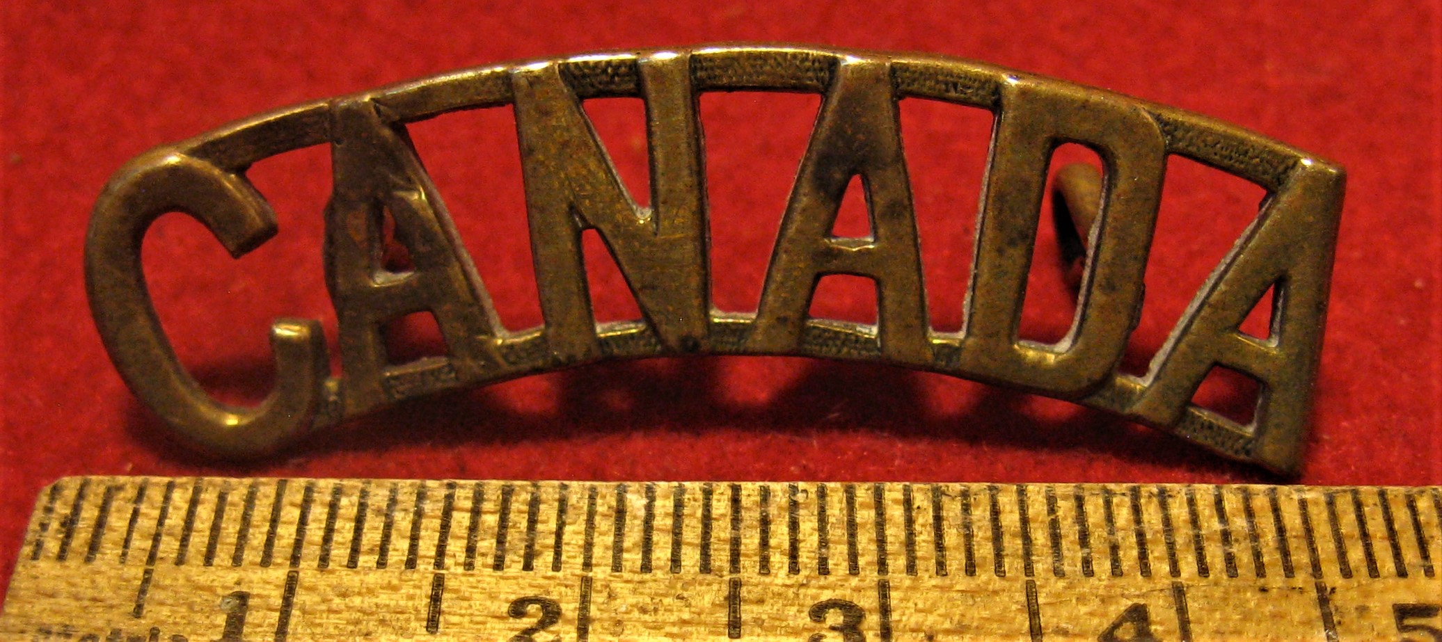 Above are the scans for this WWI era curved "Canada" shoulder title. Comes with both lugs original and in good order. An excellent solid brass piece!