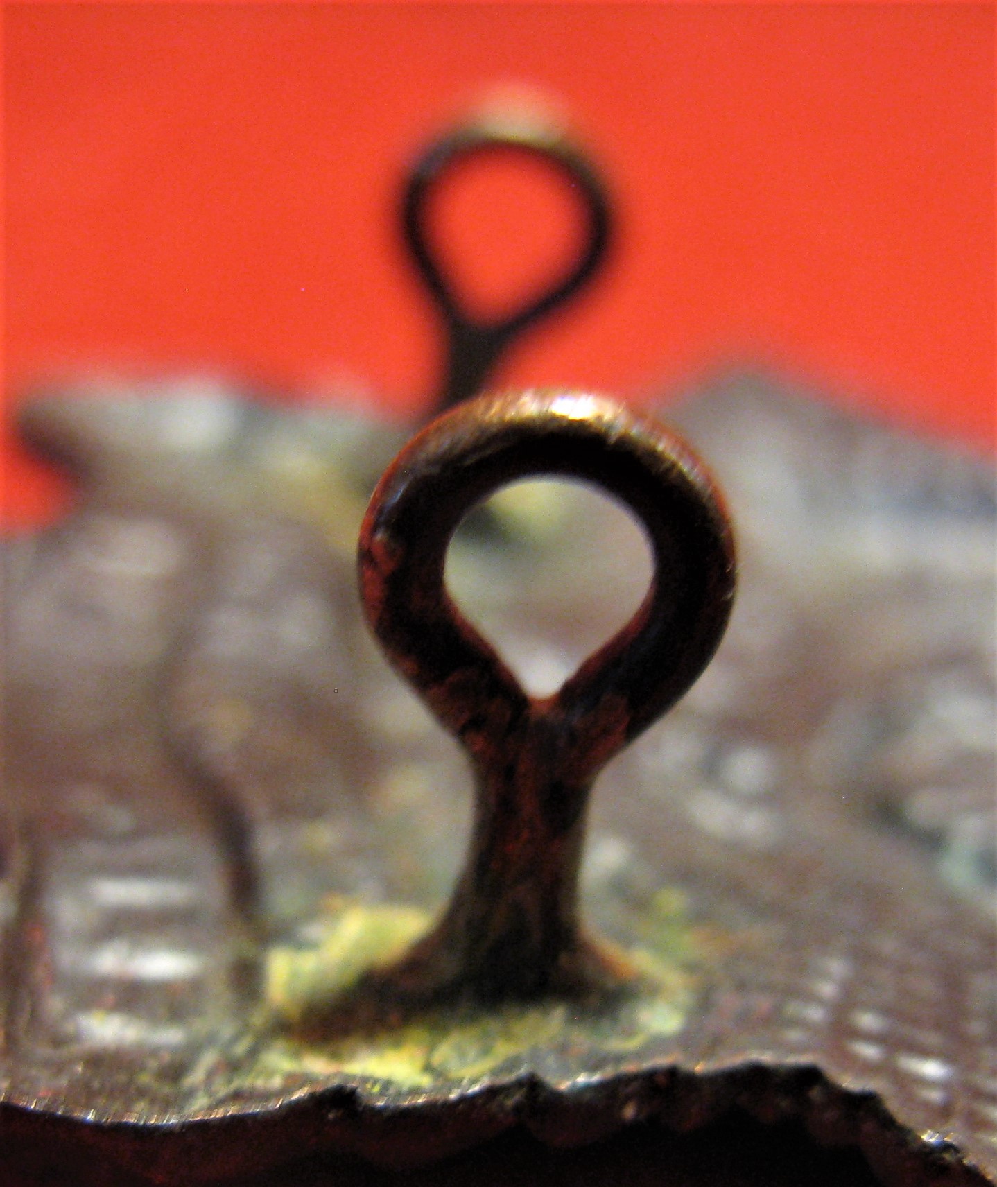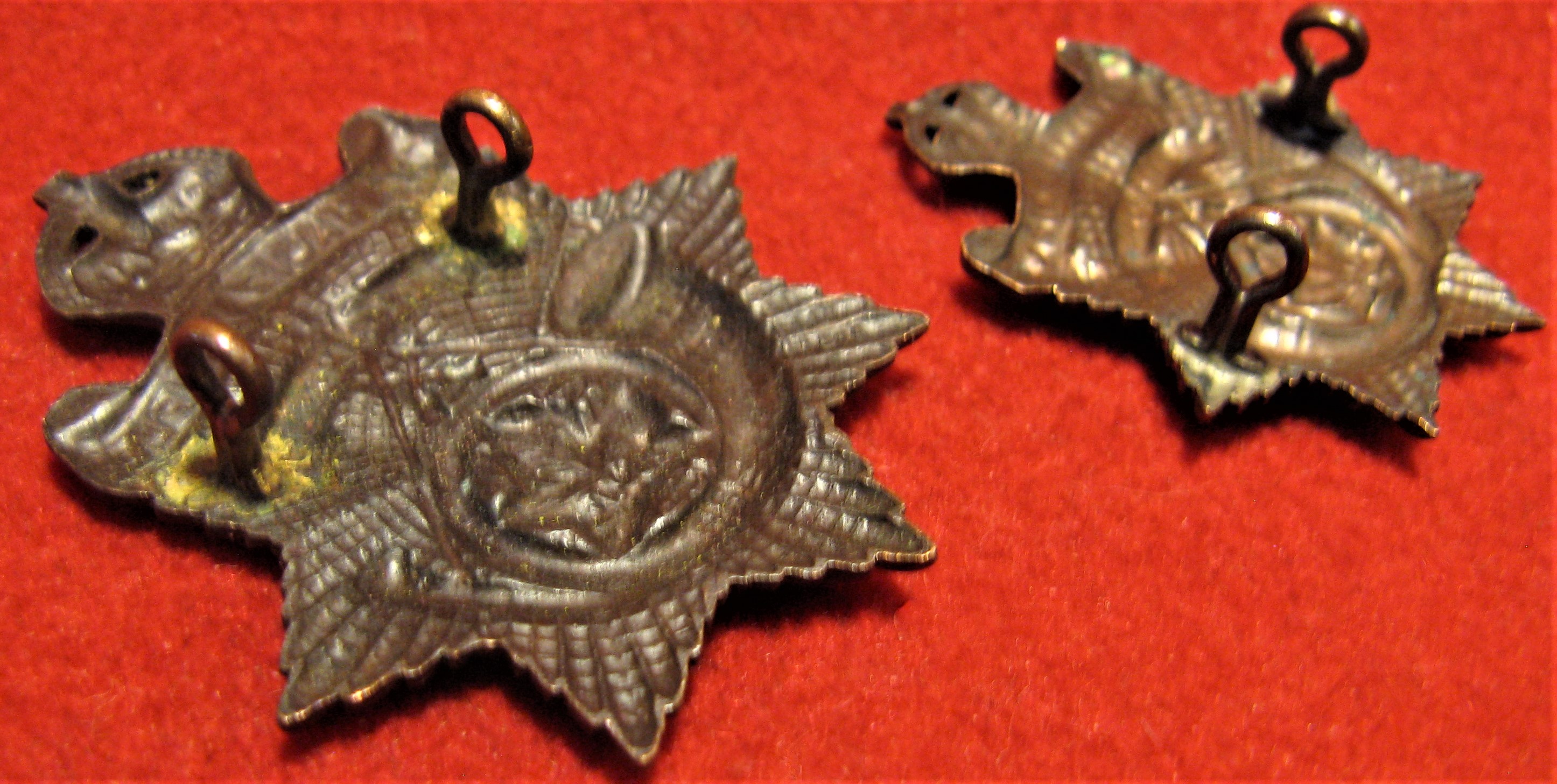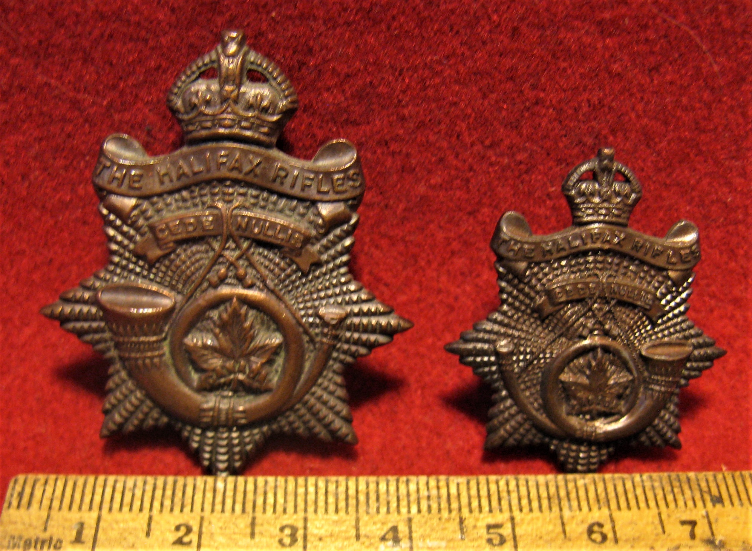 The scans above show a set of 2 which includes a uniform cap badge and the collar for the WW2 era infantry regiment called the Halifax Rifles. They are all made of browning copper using the stamping production method. In excellent condition with all original, welded stem, lug type fasteners intact on the badges. Note the bugle in the badge design, clearly indicating an Infantry regiment.