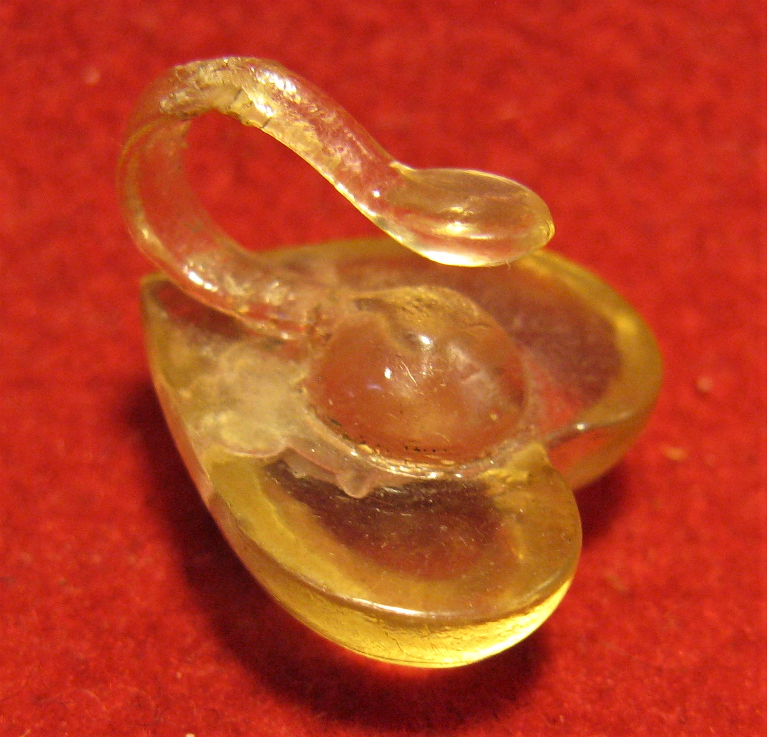 You are viewing a WWII era Canadian Infantry sweetheart "Button-holler". It is made of clear celluloid material, with a small RCAF emblem inserted into the celluloid material. Some have concluded that this was made from the celluloid material used for the cockpits of the WWII aircraft . The really unique feature of this sweetheart pendant is its heart shape. This item is still in very good condition. View scans for details.