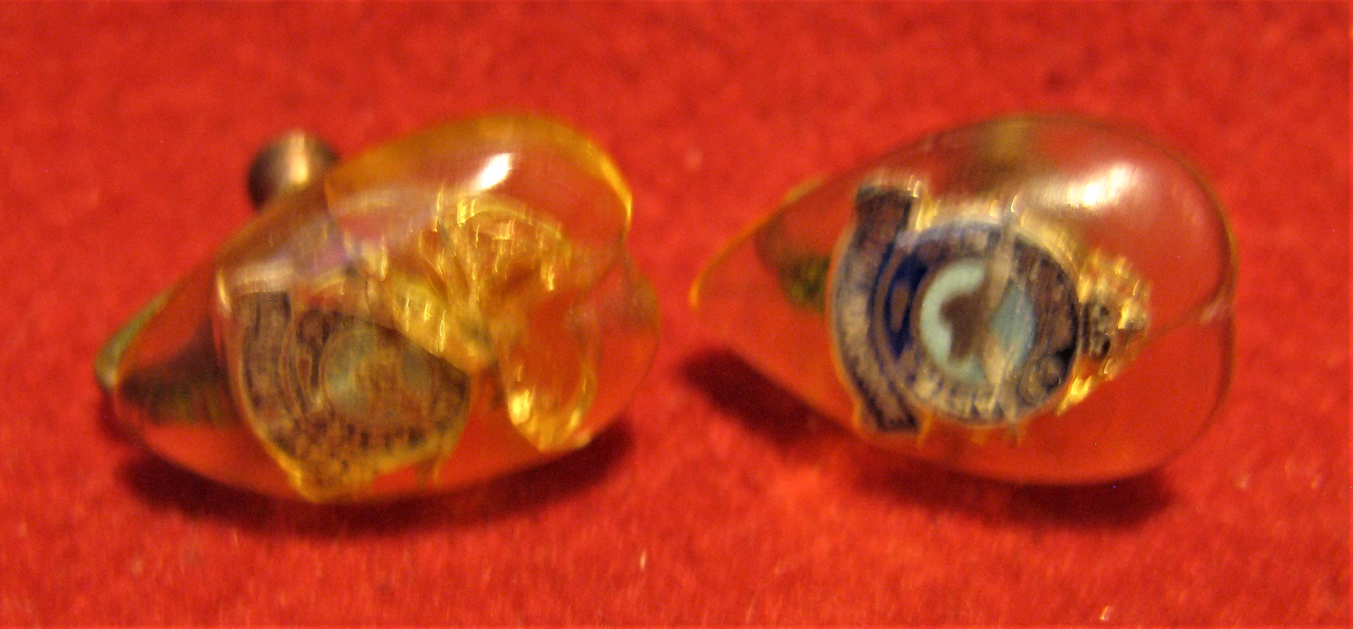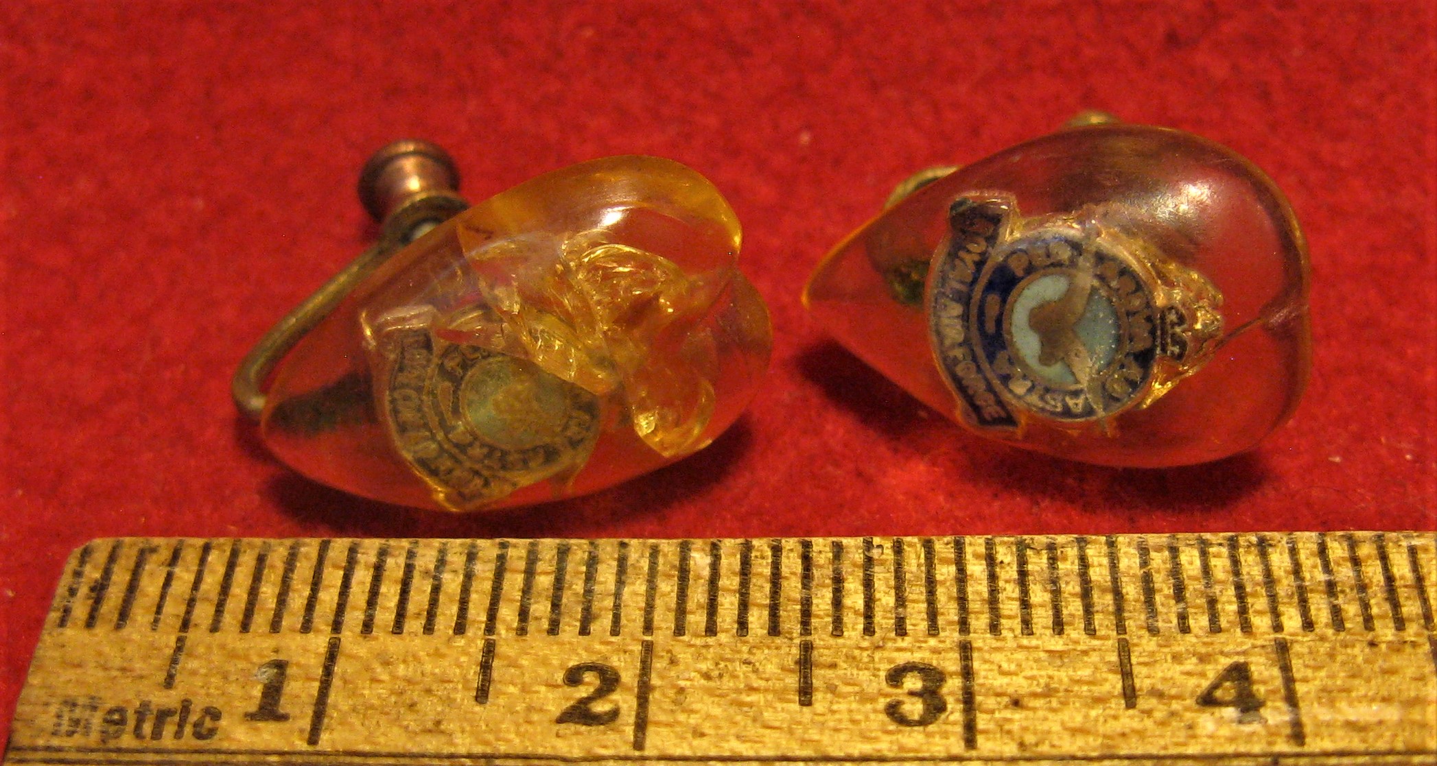 You are viewing a WWII RCAF sweetheart earring set. Made of celluloid material, with a small RCAF insignia inserted into the earring celluloid. Some have concluded that this celluloid was the material used for the cockpits of the WWII aircraft . The really unique feature about this set is its rarity. Not one I have seen previously. The earring clasps are still in quite usable condition. View scans for details.