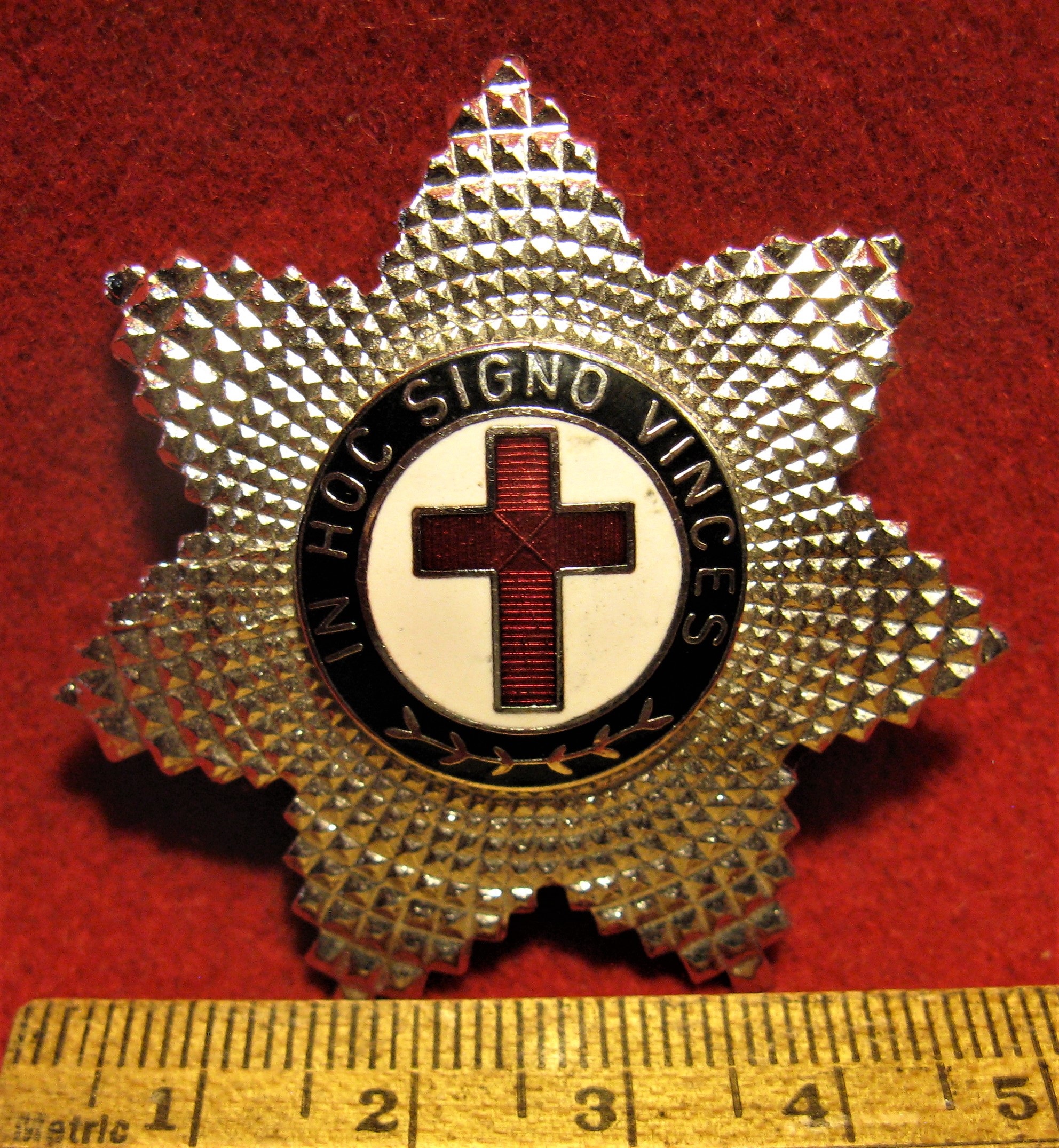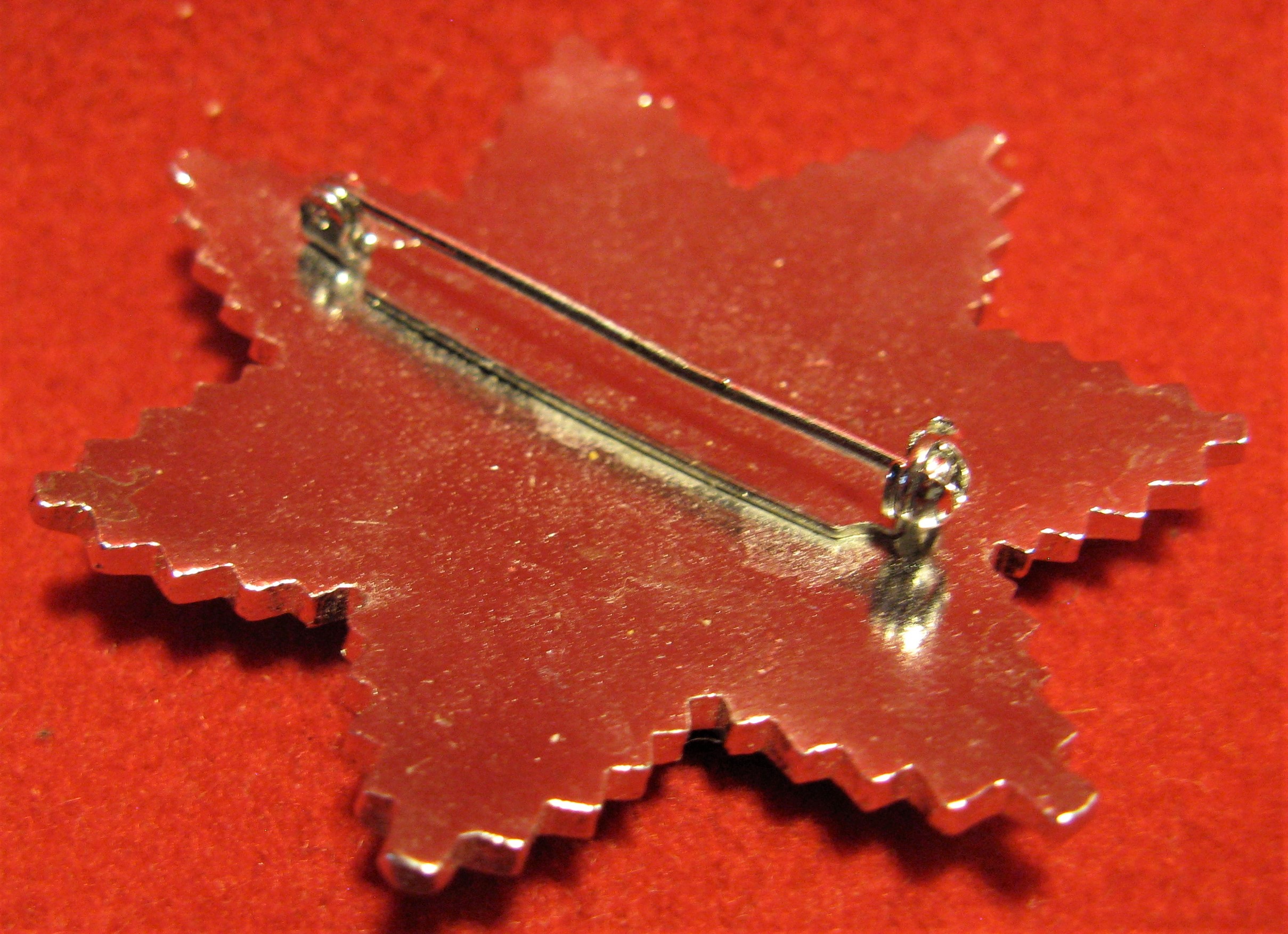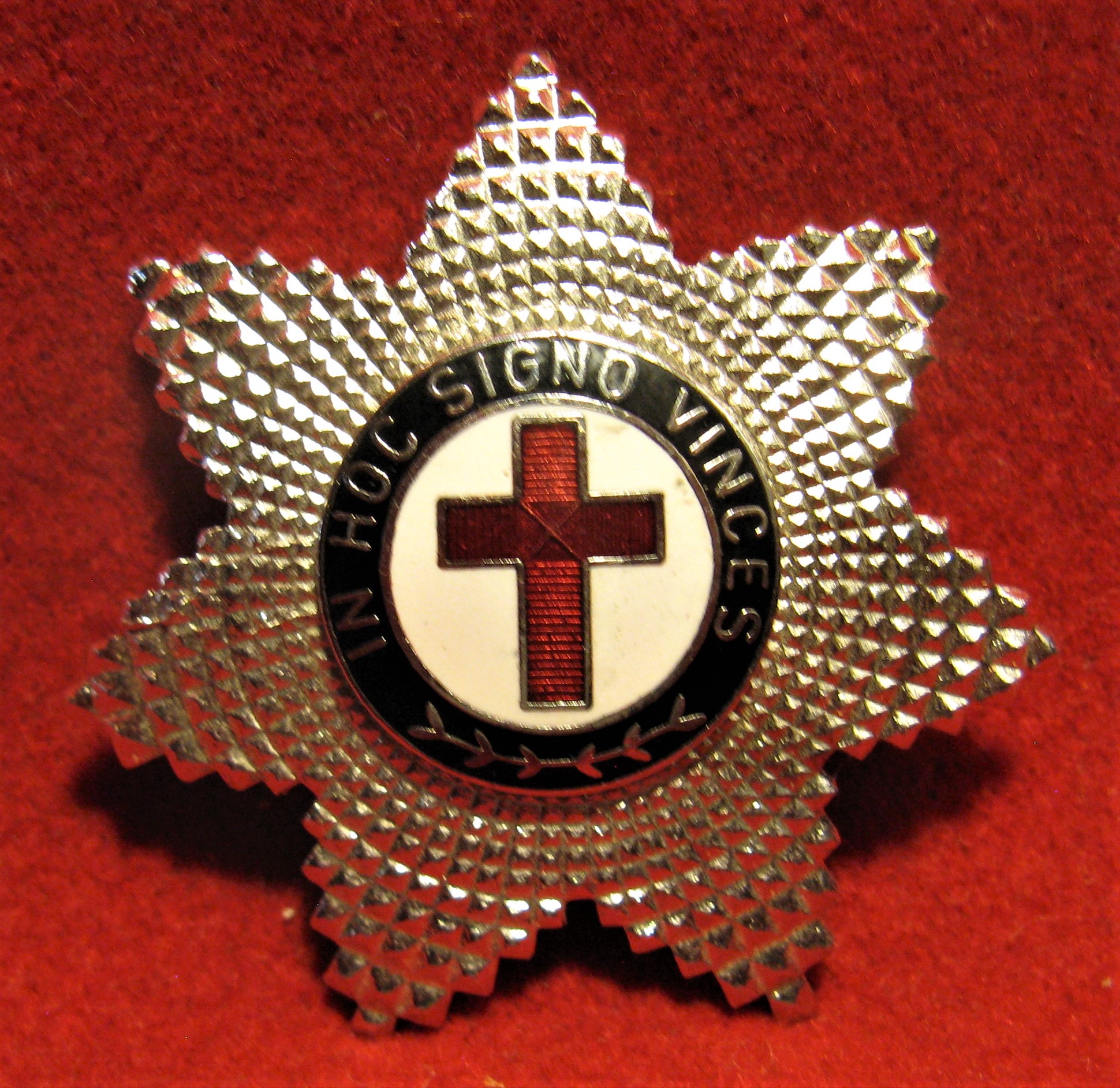 The scans above show a small uniform button-holler badge for the St Andrews Ambulance Corps. Made of enameled brass and in very good condition with the button hole fastener in good order. The octagonal cluster badge with straight pin attachment was found with the smaller badge. It appears to be made of a white metal compound with its enameling in 100% condition. May have a religious significance.