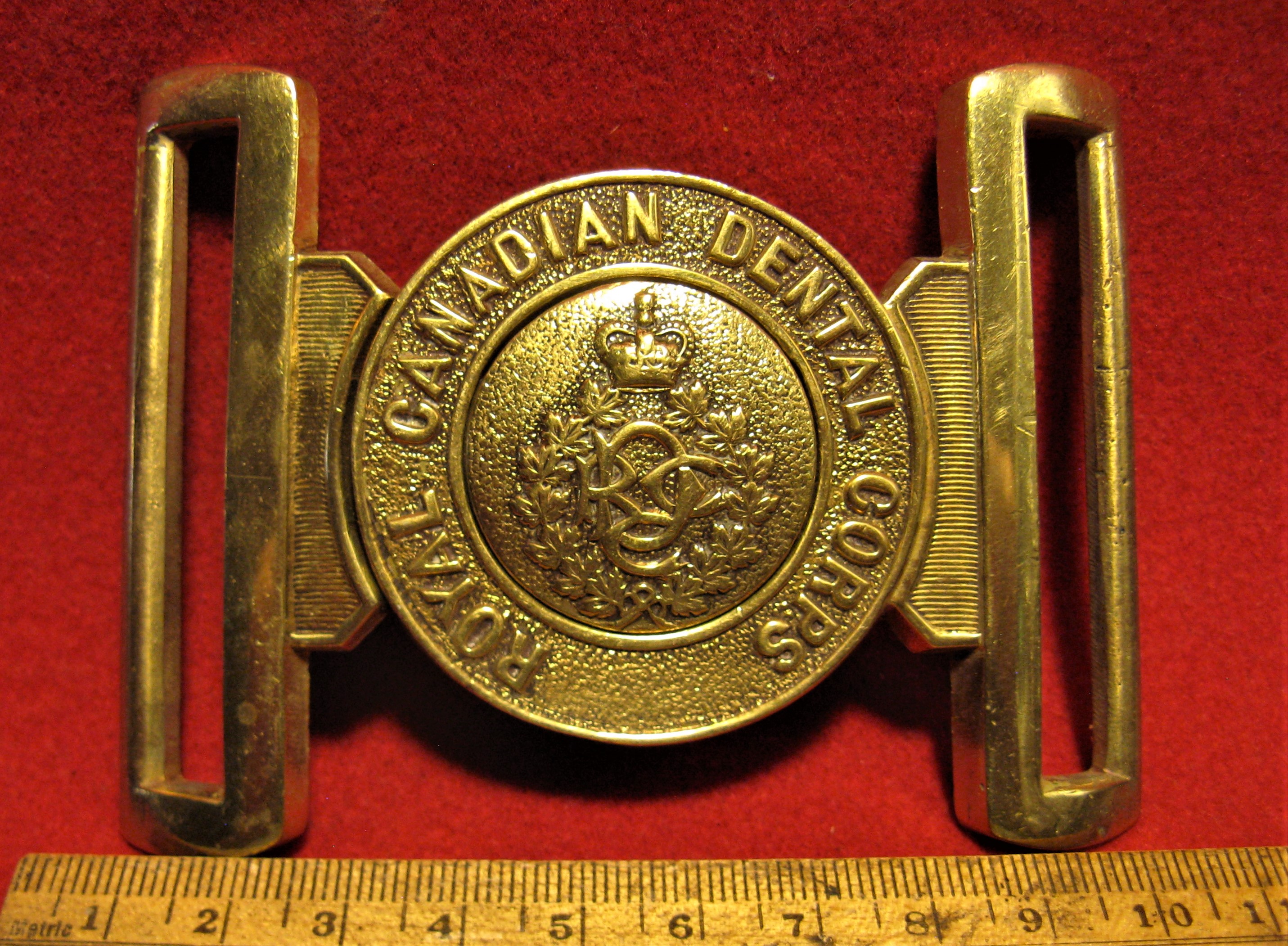 You are viewing the scans for a QC Era Army Dental Corps Belt Buckle. A 2 piece buckle made of heavy bronze with 2 belt attachments built in. Made with a center roundel with a miniature cap badge insignia in the middle. Was used with the heavy web service belt, and later with the white plastic dress belt of the Trudeau era. View scans for details.