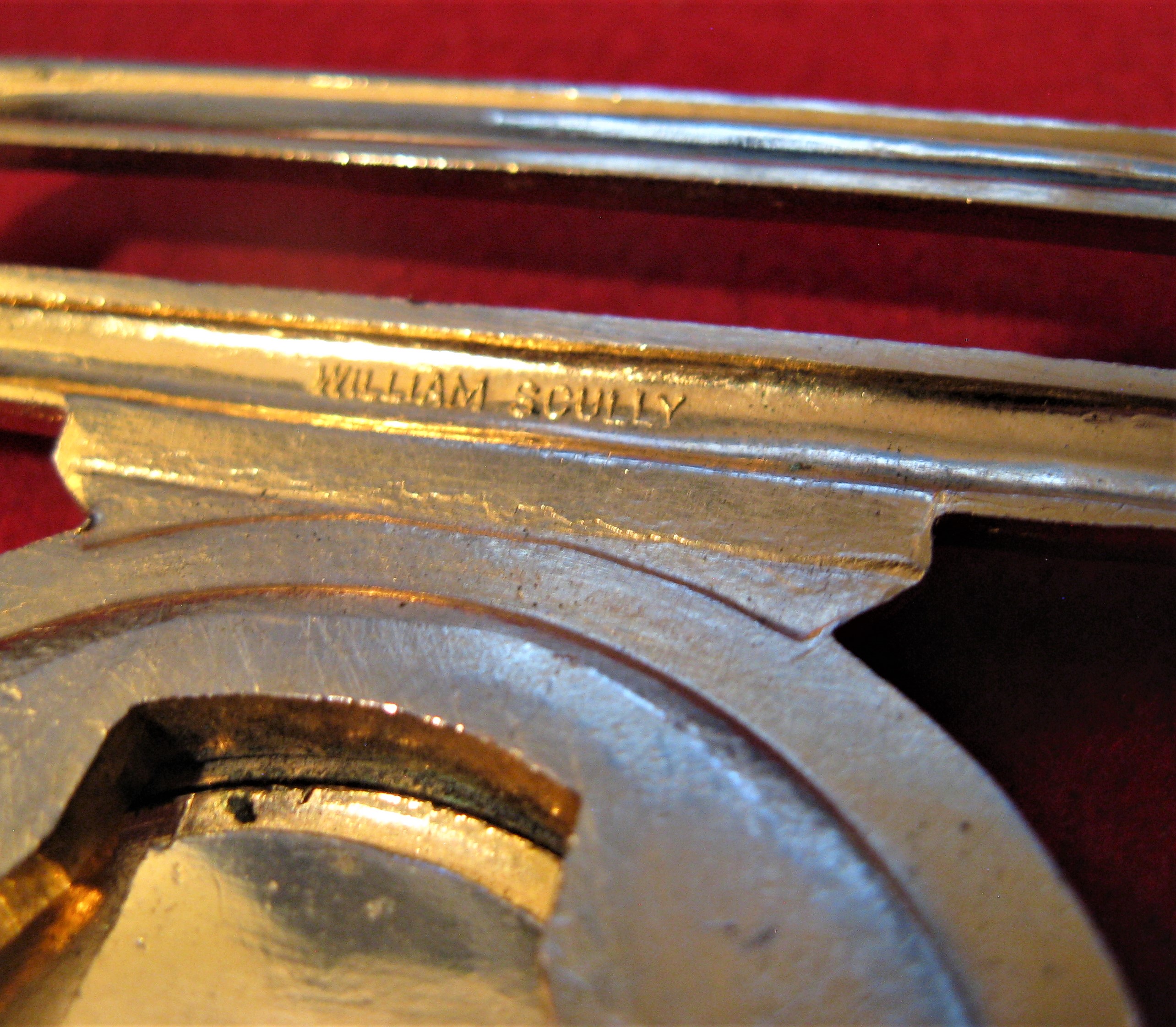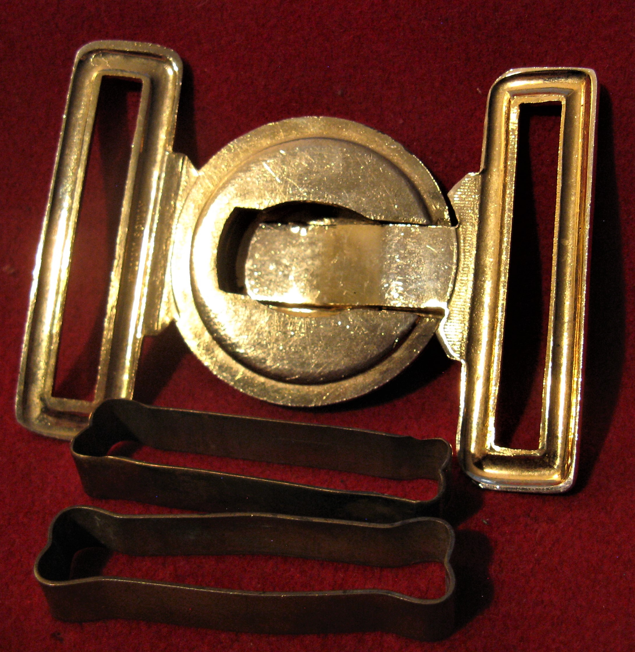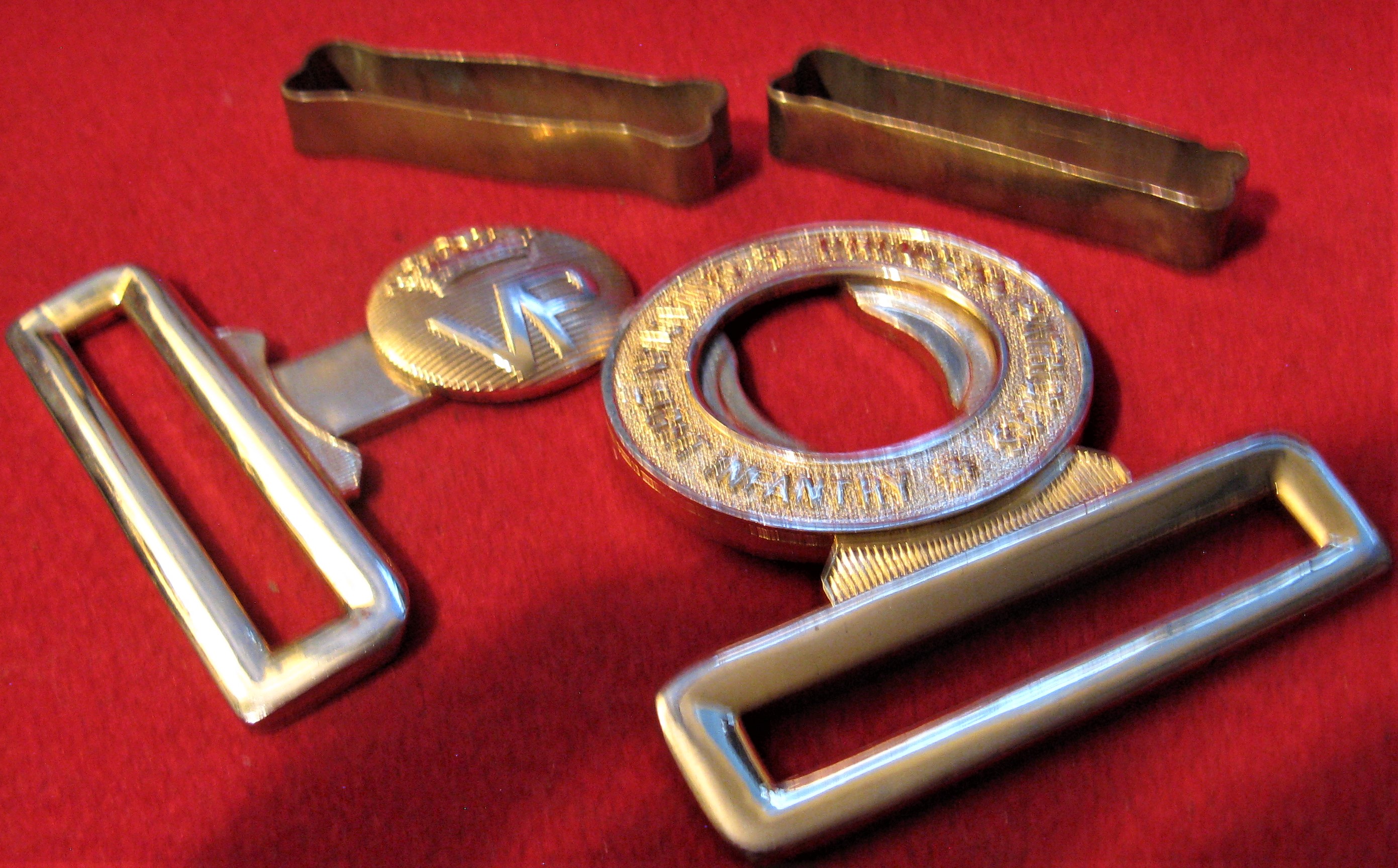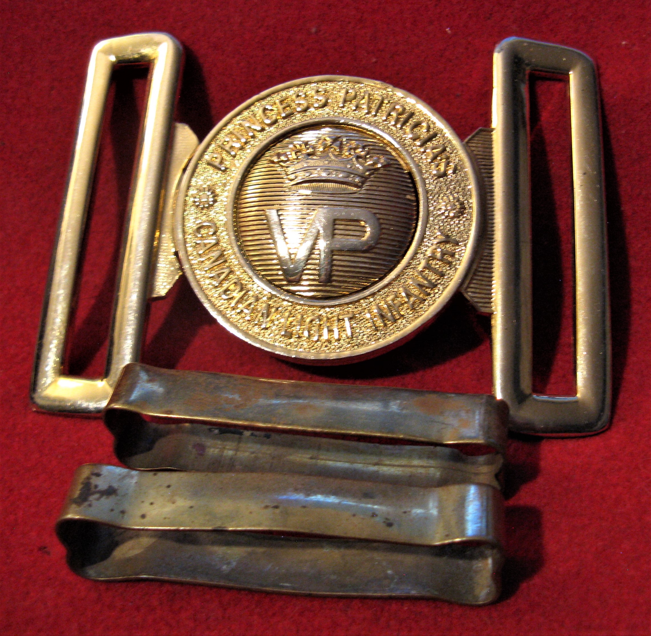 A 2 piece buckle made of heavy bronze with 2 belt attachments built in. Also included are two belt rings for the web belt. Made for the PPCLI with their characteristic "VP" under crown inscribed. Was used with the heavy web service belt, and later with the white plastic dress belt of the post war era. Has a "William Skully Montreal" hallmark ... View scans for details.