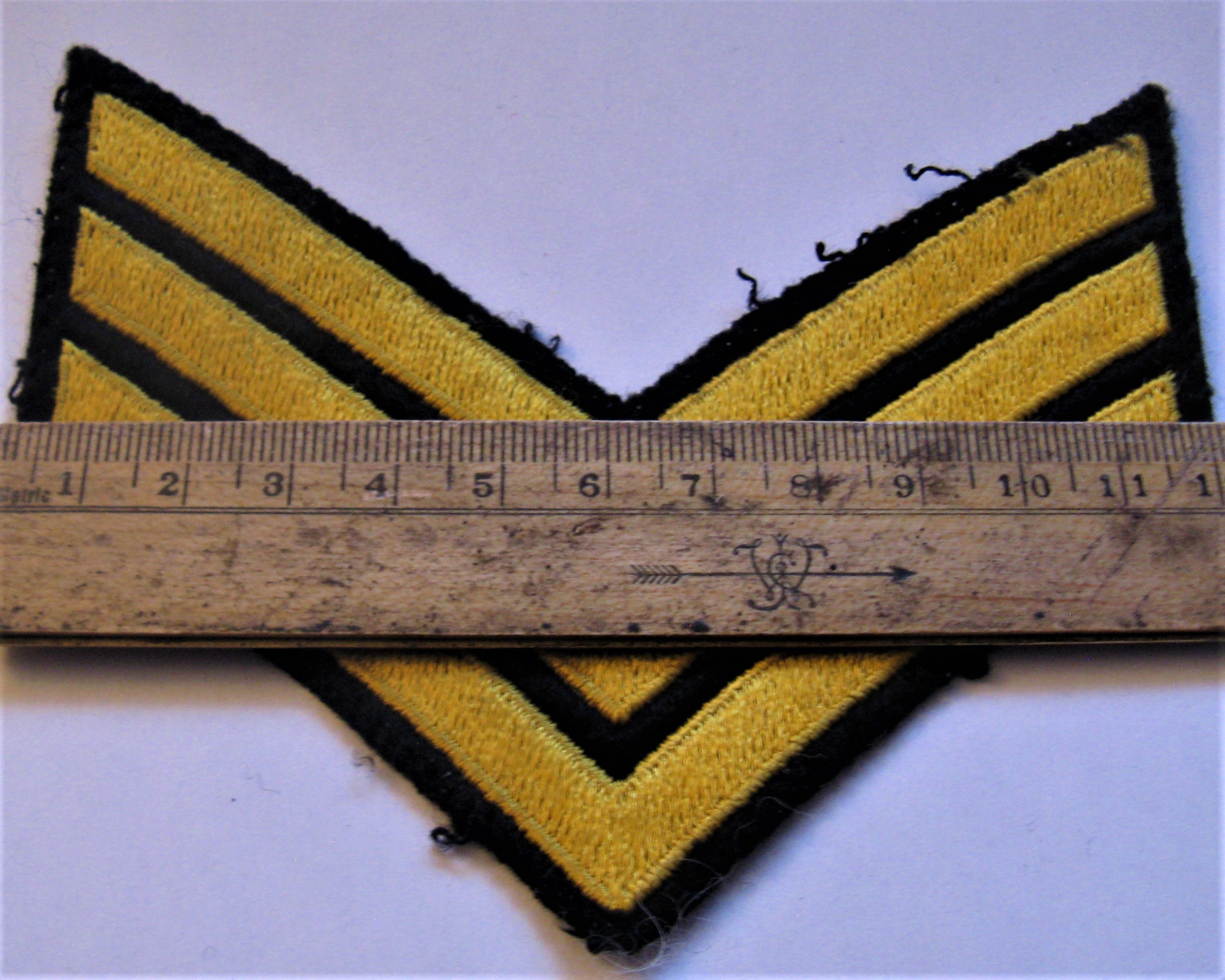 You are viewing a uniform sergeant rank of 1970's vintage. These uniform insignia were made with gold colored cotton embroidered thread. This one is still in excellent field used condition, all on a black background with a cheesecloth backing. Color or size appearance are due to photography.