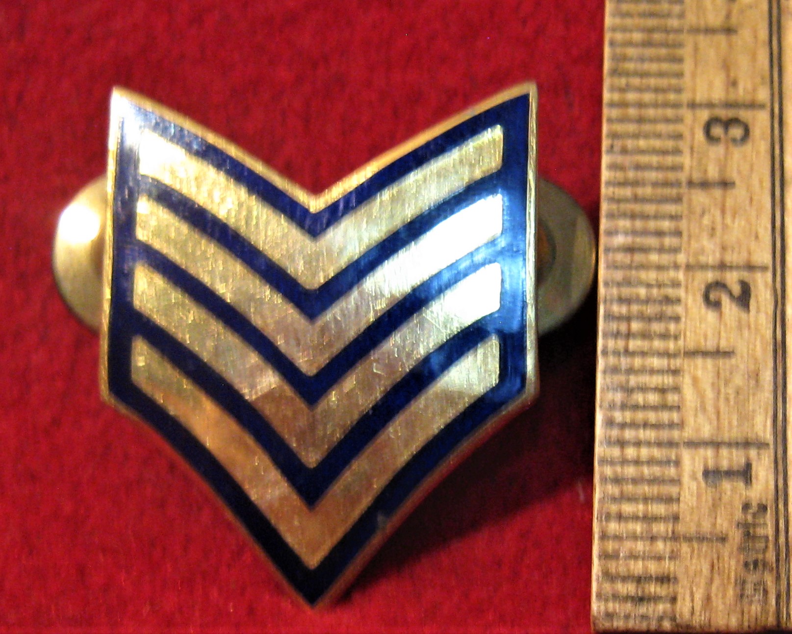 You are viewing a single4 chevron rank insignia. It is made of enameled polished brass with pin back type fasteners suggesting it is a more modern piece (1980's) All in good order and quite wearable. We have 3 of these in stock pr3esently.