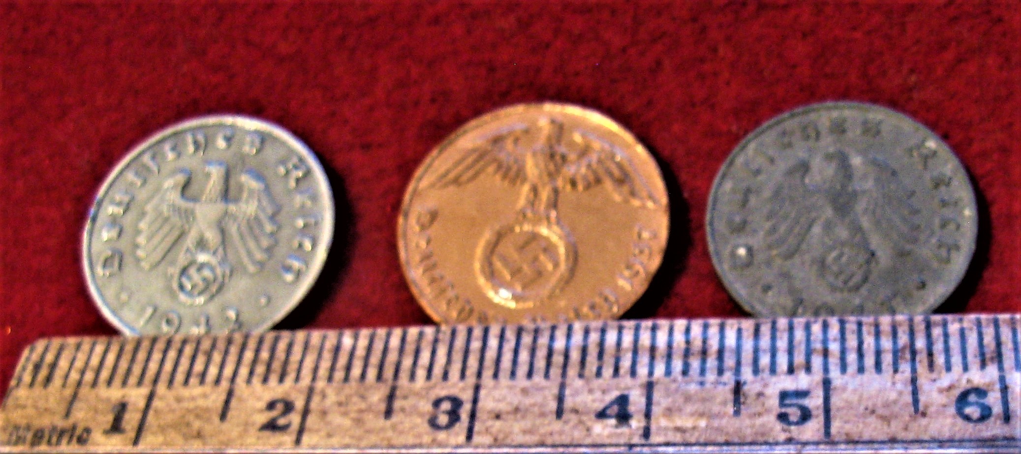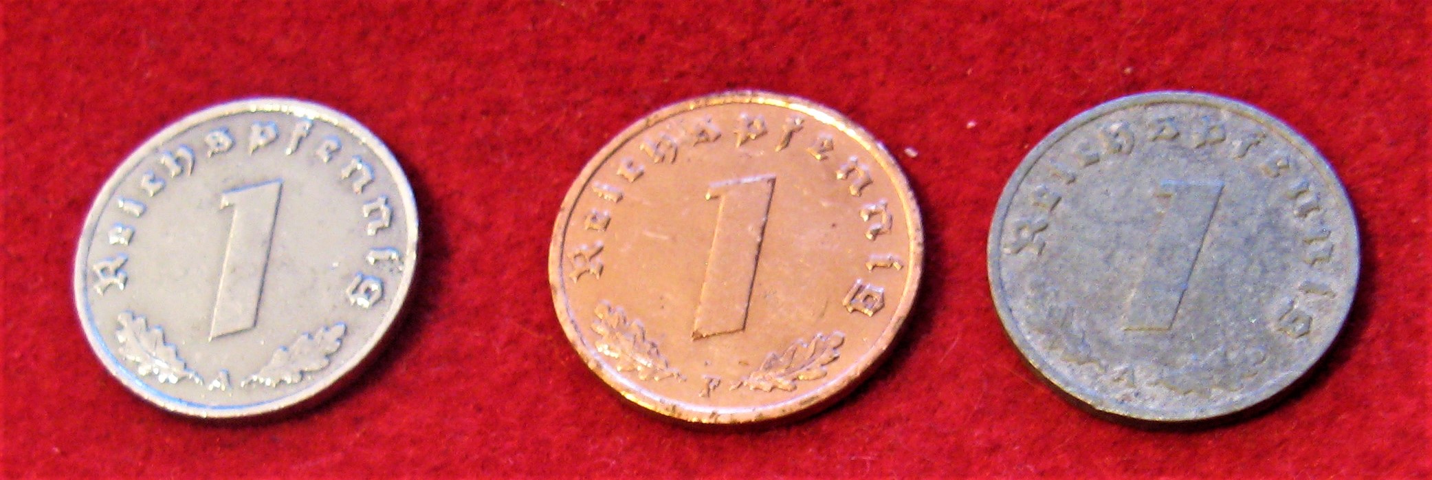 You are viewing an 3 lot of WWII era German coins. They are all 1 phenning denominations, made of (copper) (brass), and (tombac). View scans for dates.