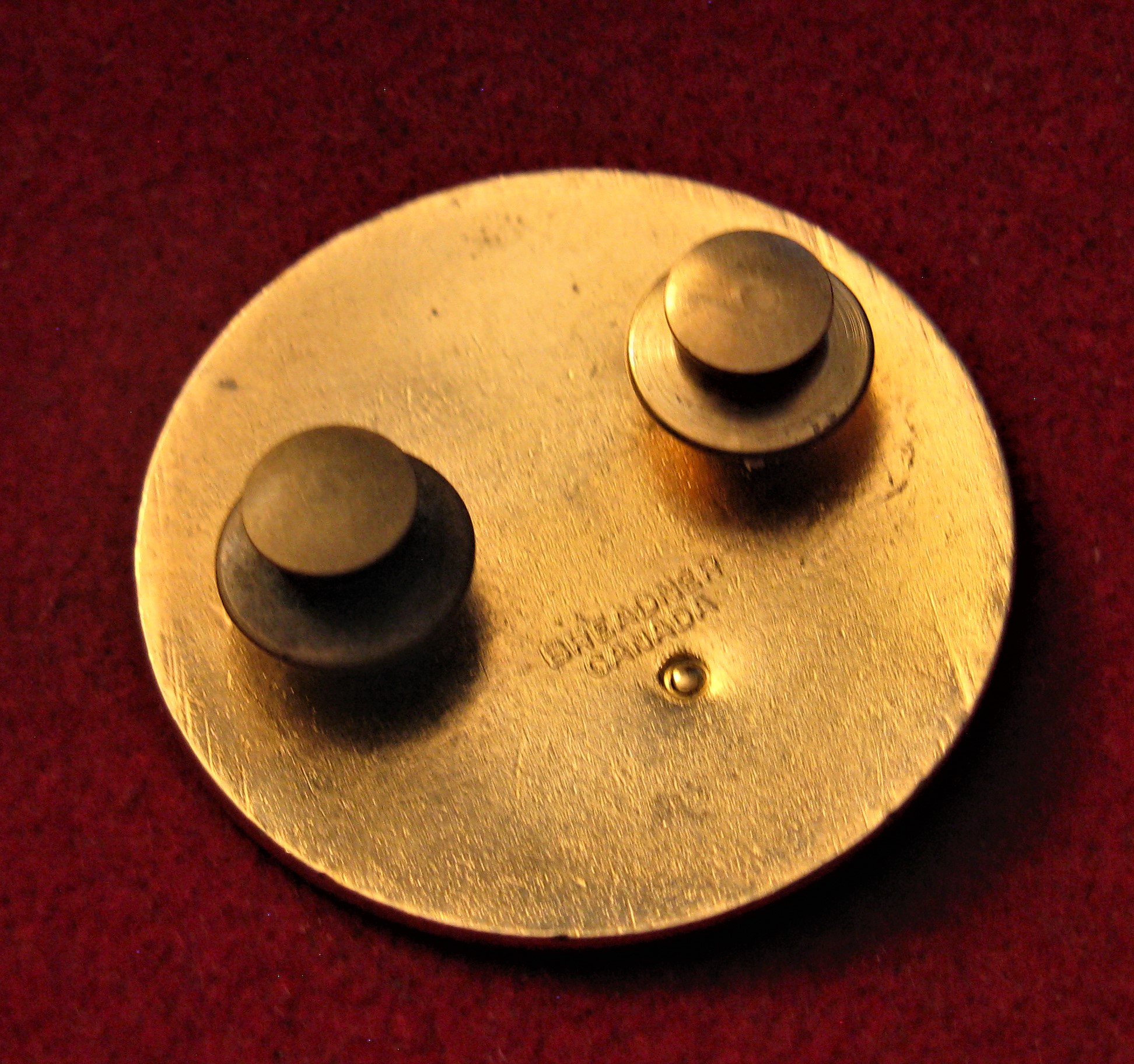 This is a excellent example of a post 1968 uniform badge. Made of brass with perfect enameling. Has a gold plated border and is Hallmarked "Breadner Canada". The motif is a little uncommon with an Eagle over a non-Commonwealth style crown with three stars. May be Air force related due to the design appearance.. Don't know much about it though???