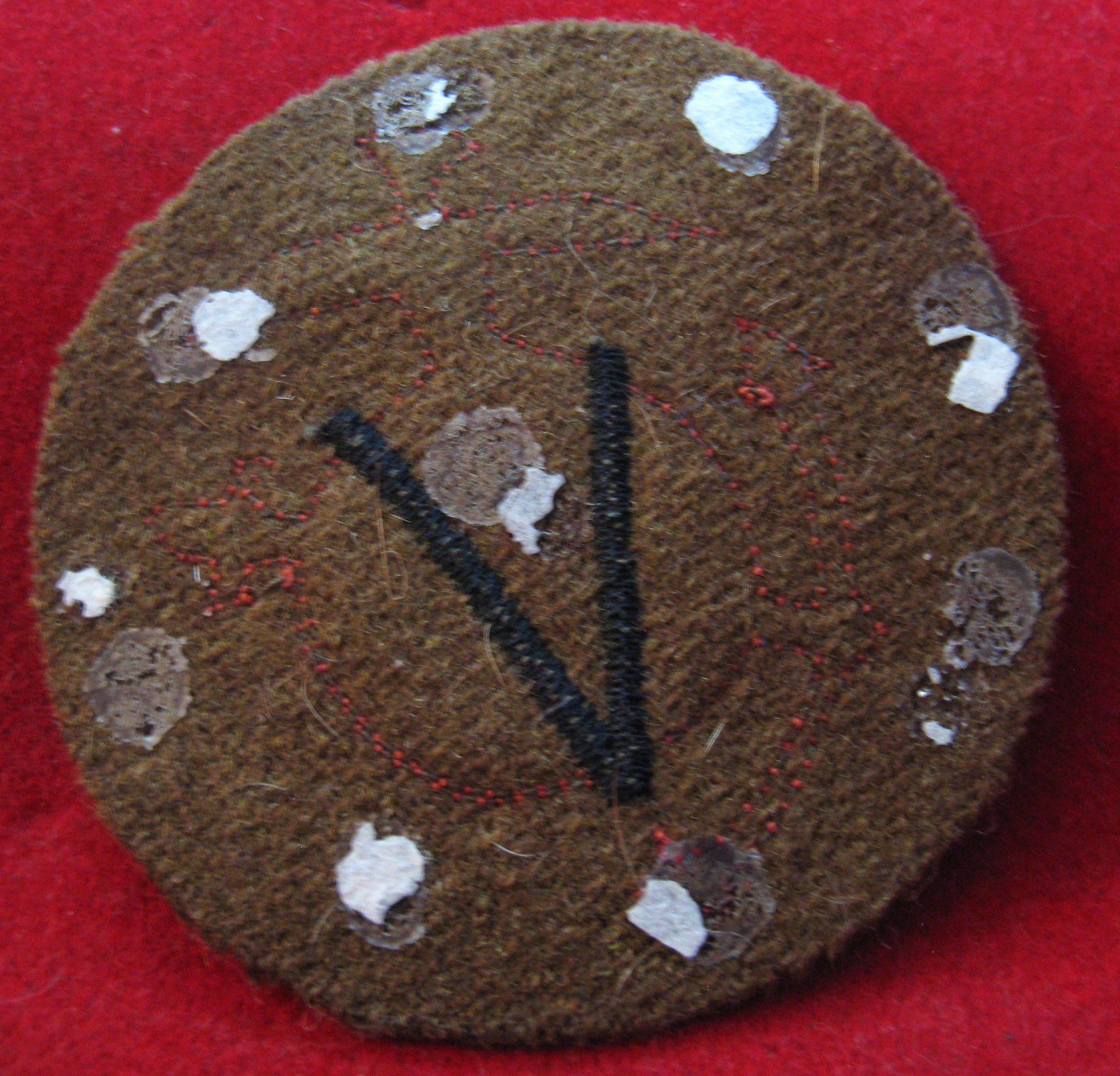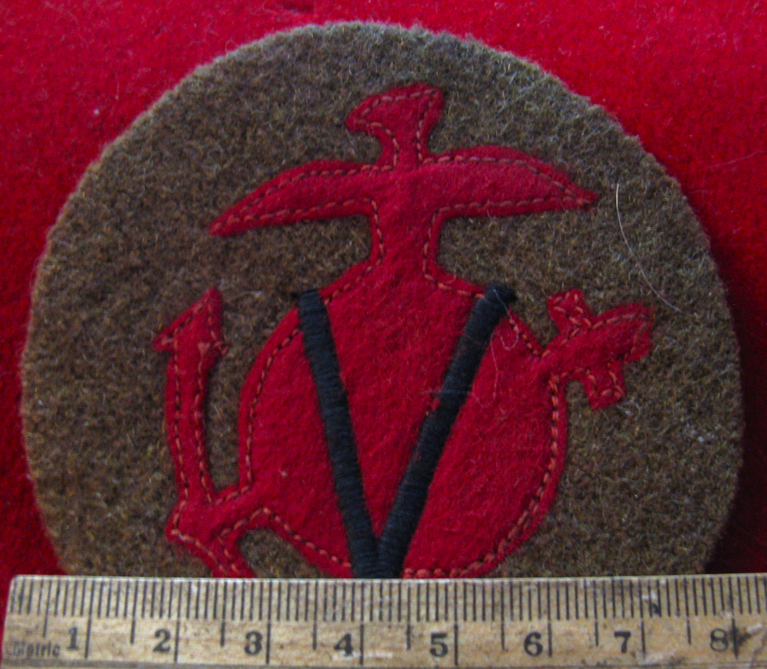 You are viewing a rare US Army WWI, uniform badge for Fifth Marines Battalion(?) This badge is a felt Marine Corps insignia sewn onto a Khaki colored wool roundel. The back shows spots of glue residue, indicating that it was in a collection at one time. No damage or mothing on this item.
