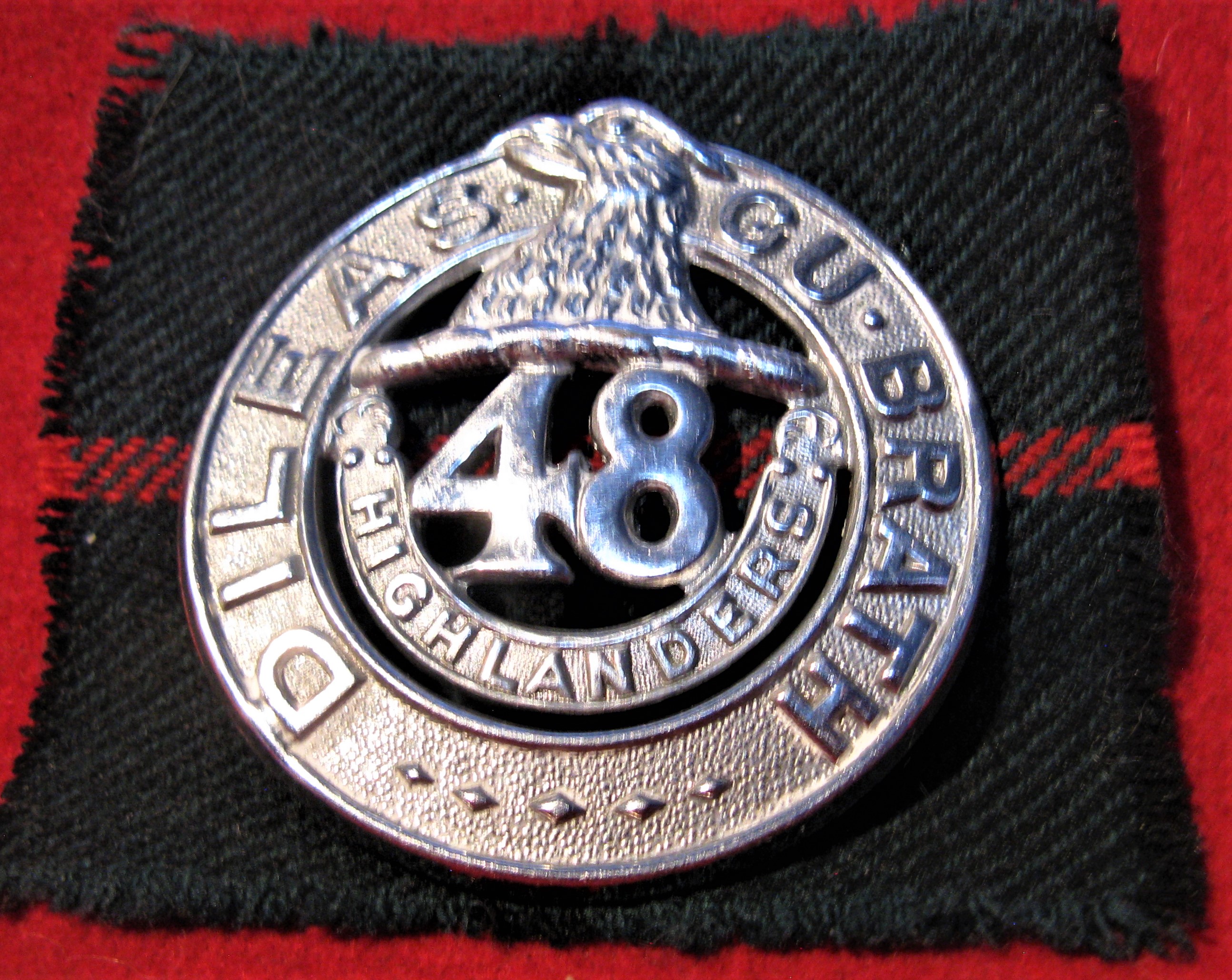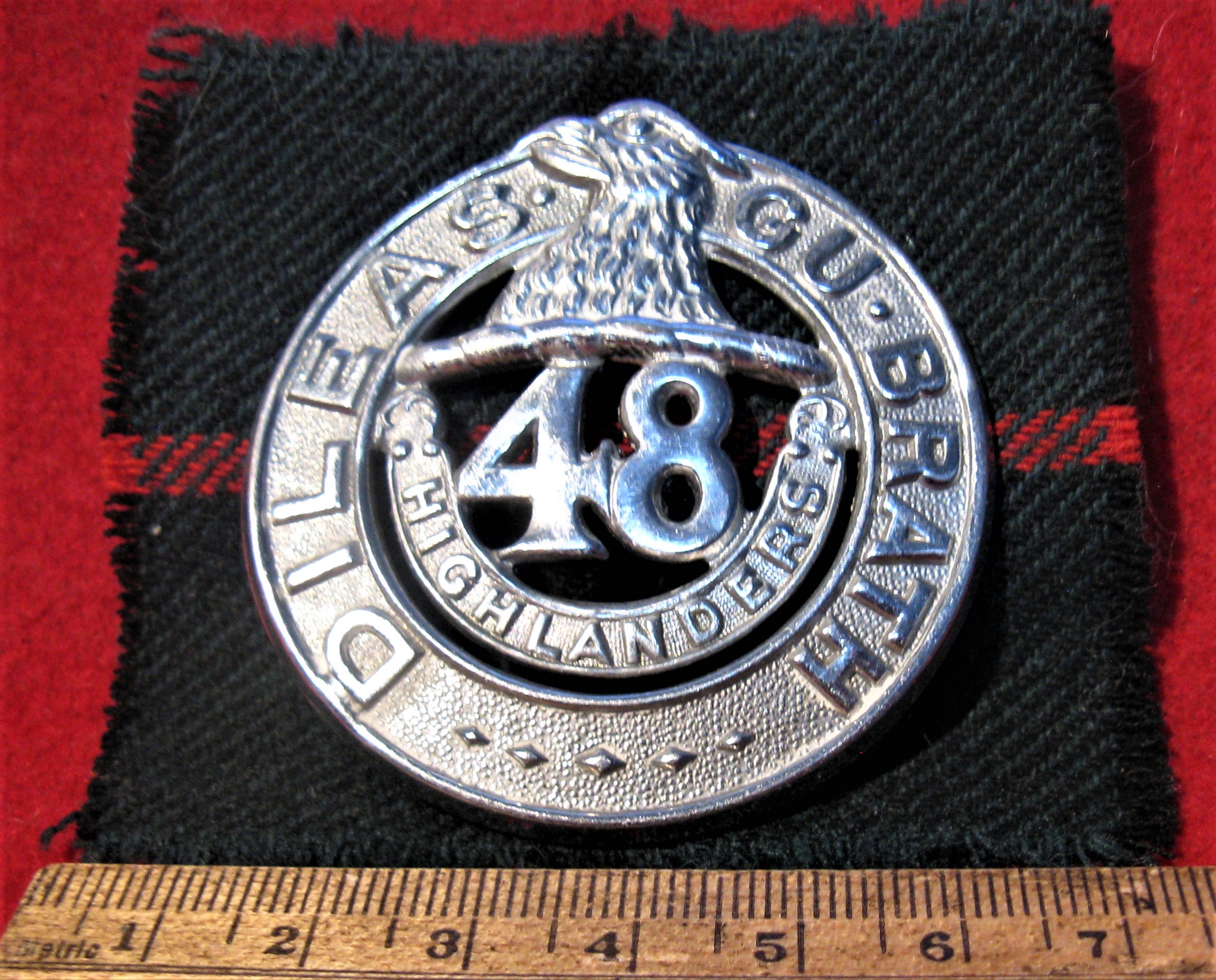 You are viewing the scans of a WW2 era cap badge for the 48th Highlanders of Canada. This is a heavy metal badge which appears to be chrome plated. It comes with its cross pin and a tartan backing. Both lugs original and in good order. A beautifully made badge still in excellent condition. View scans for details.