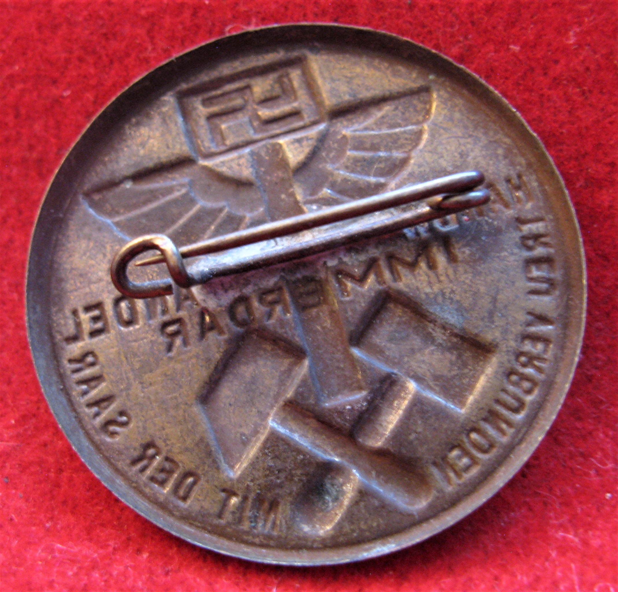 You are viewing a German pre WW2 "Tinnie" undated commemorating the Saar workers. This round, nicely stamped badge, is made of brass (unusual for "Tinnie" style badges). Safety pin style backing is original and intact.