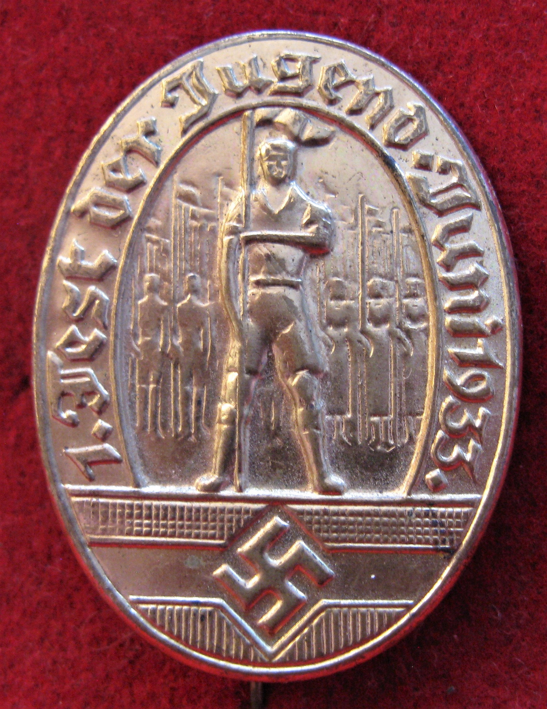 You are viewing a German pre WW2 "Tinnie" 1933 dated apparently commemorating a worker event. This oval, nicely stamped badge, is made of shiny brass (unusual for "Tinnie" style badges). Straight pin style backing is in good order.