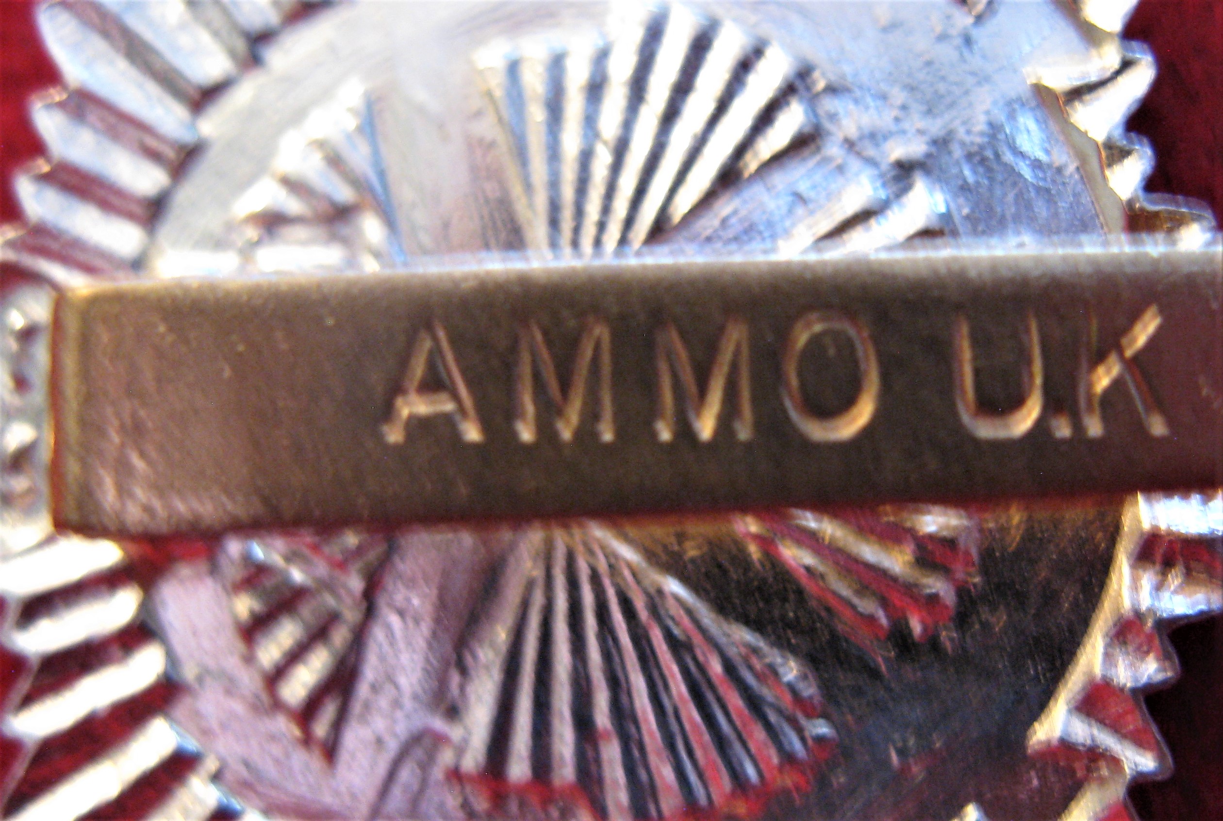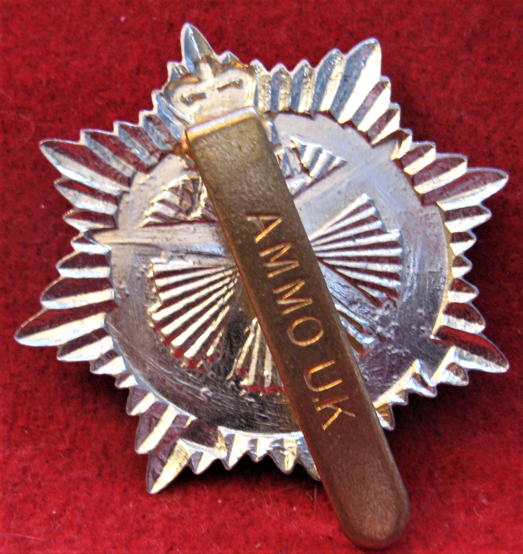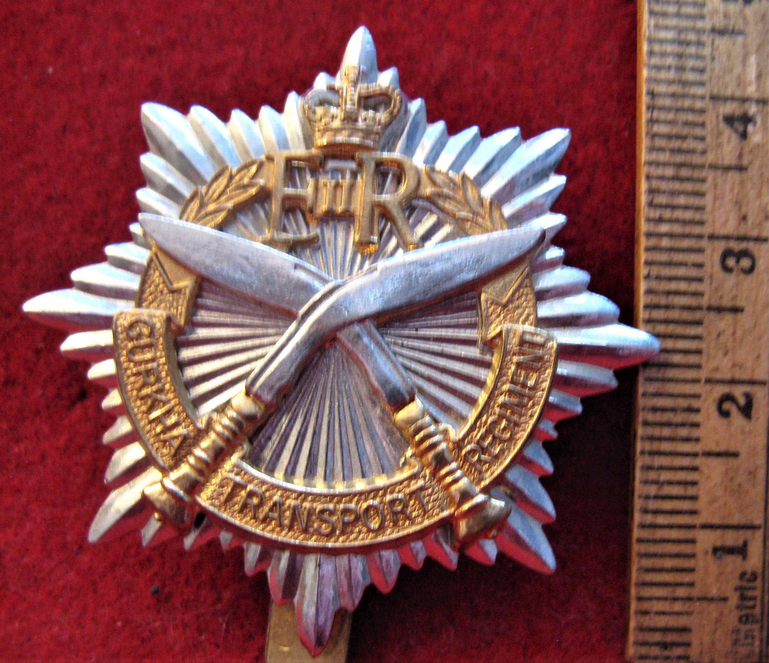 You are viewing a post 1953 QC era Cap badge for the Gurkha Transport Regiment . This one is hallmarked "AMMO - UK", a British made piece originally. The badge is a bimetal piece made with a tang type attachment. The design of the badge consists of crossed kukris under an ER script under a Queen's Crown, all in gold colored metal, set over a white metal sunburst. View scans for details.