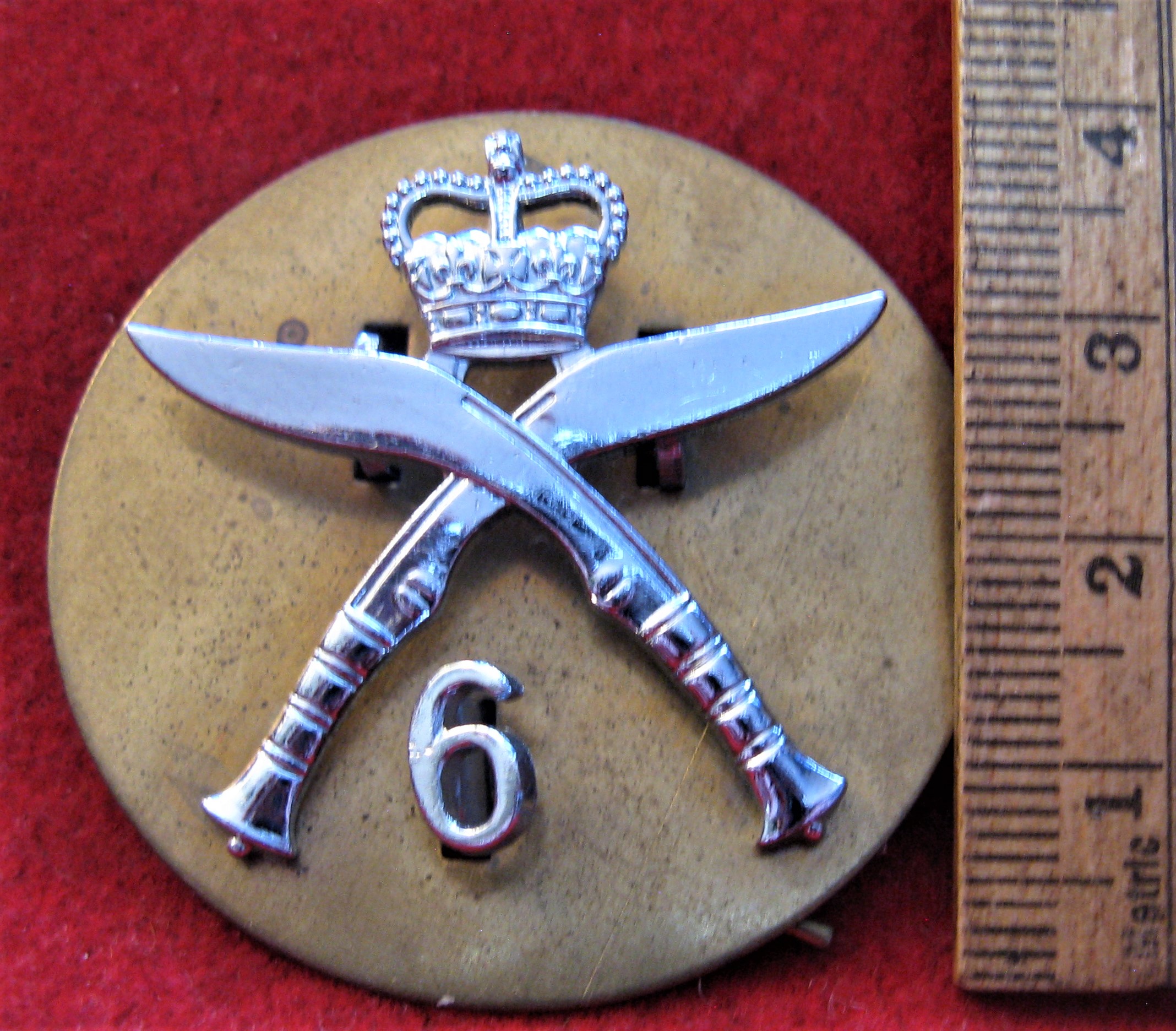 You are viewing a post 1953 QC era beret badge for the 6th Gurkha Regiment . it comes with a brass back stiffener, a British made piece originally. The badge is chrome plated with 2 parts, and made with lug type attachments. The design of the badge consists of crossed kukris under a Queen's Crown, all in chrome plated metal. View scans for details.