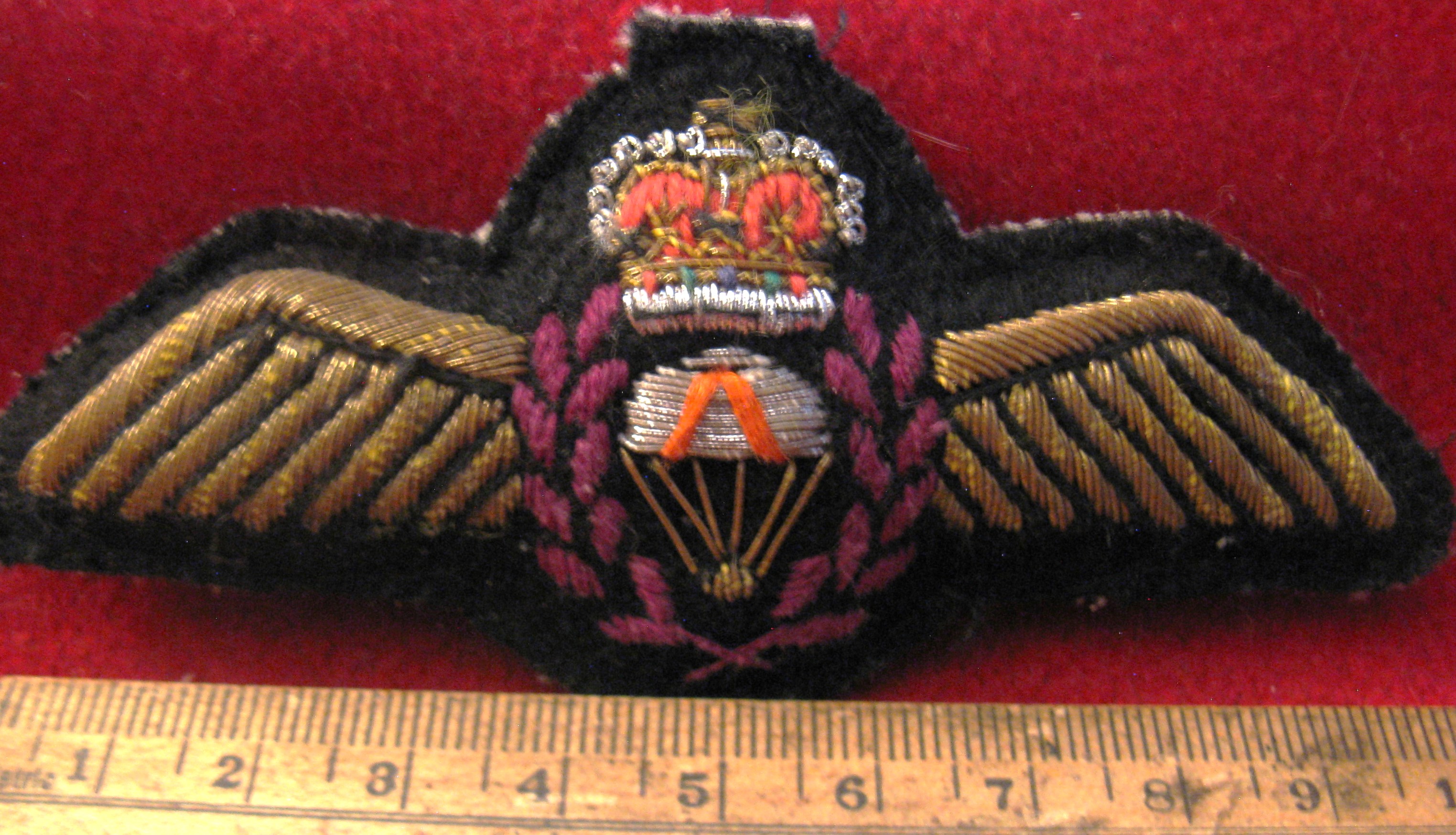 Above are the scans for this pre '68 Canadian Airborne Wings badge. It is in excellent condition with all its embroidery in good condition. Has a thin canvas type black backing.