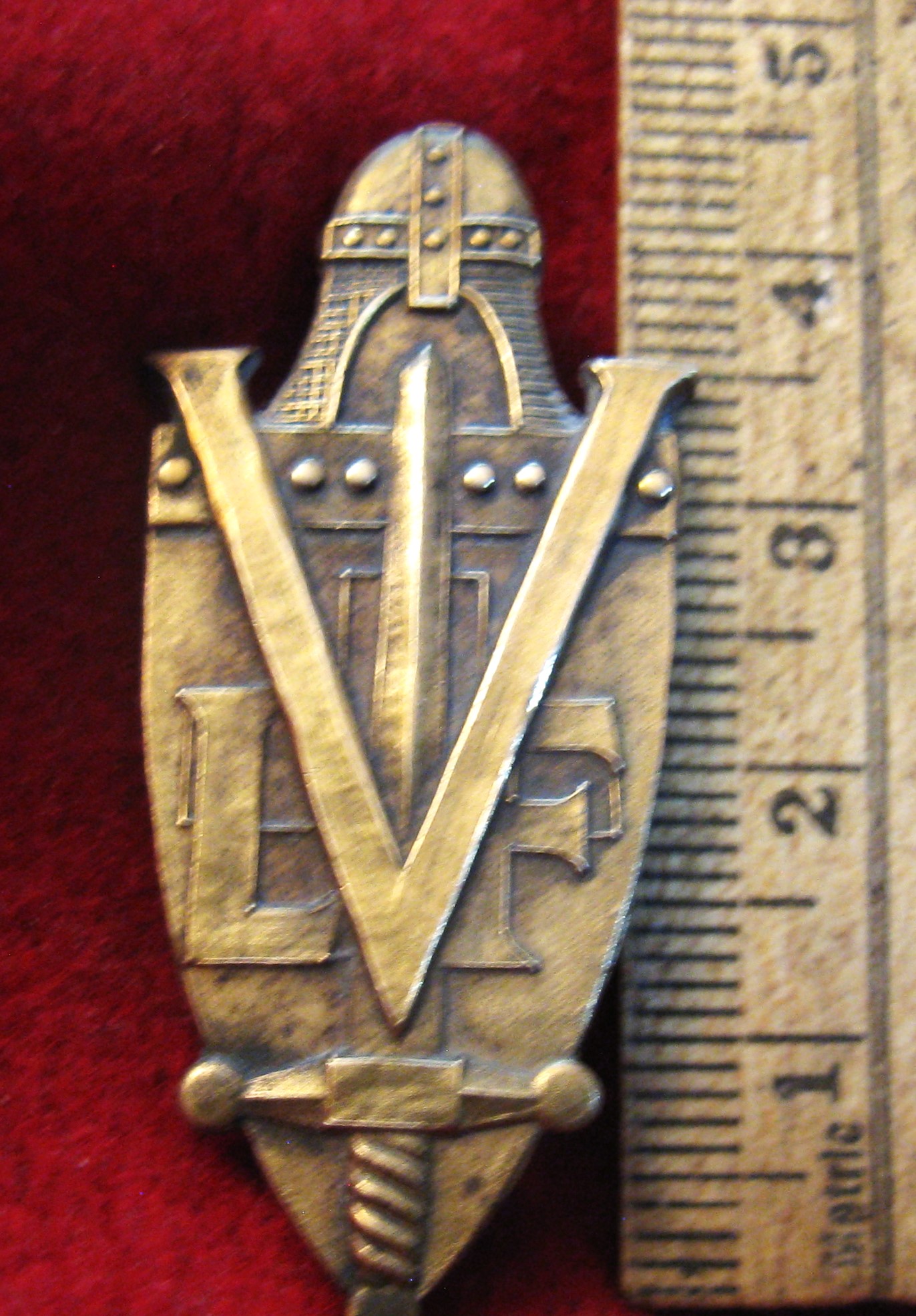 Above are the scans for this French Army uniform badge. It is made of heavy bronze. Has a large "V" over a special forces style sword with the letters "L & V" forming the background. Here is some new info from a friend of Shoulder to Shoulder...
