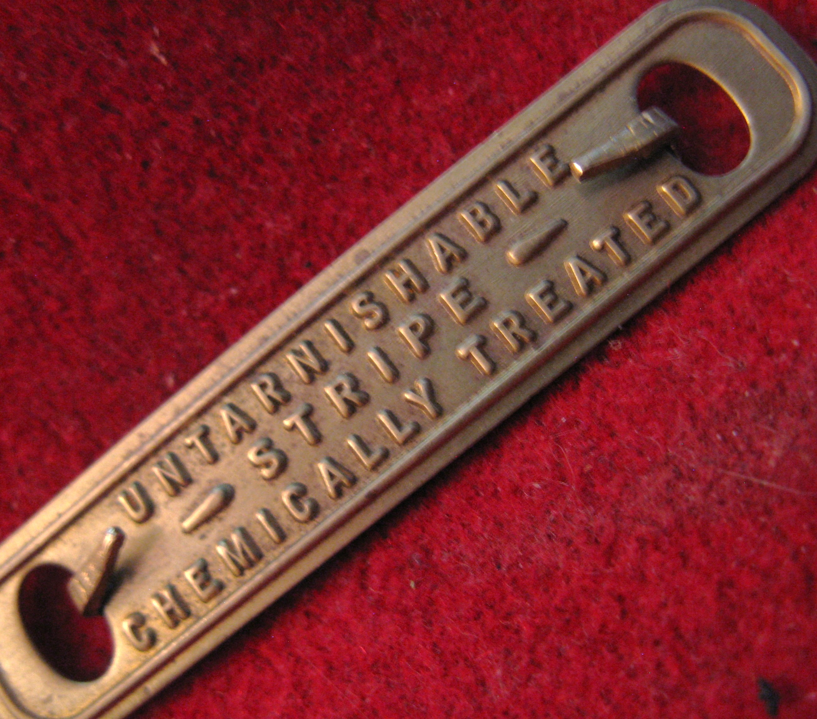 left arm of the service tunic. It is a straight brass bar with two lugs, one at each end, for attachment purposes. The backing id made of brass and all in good order, please view the scans.