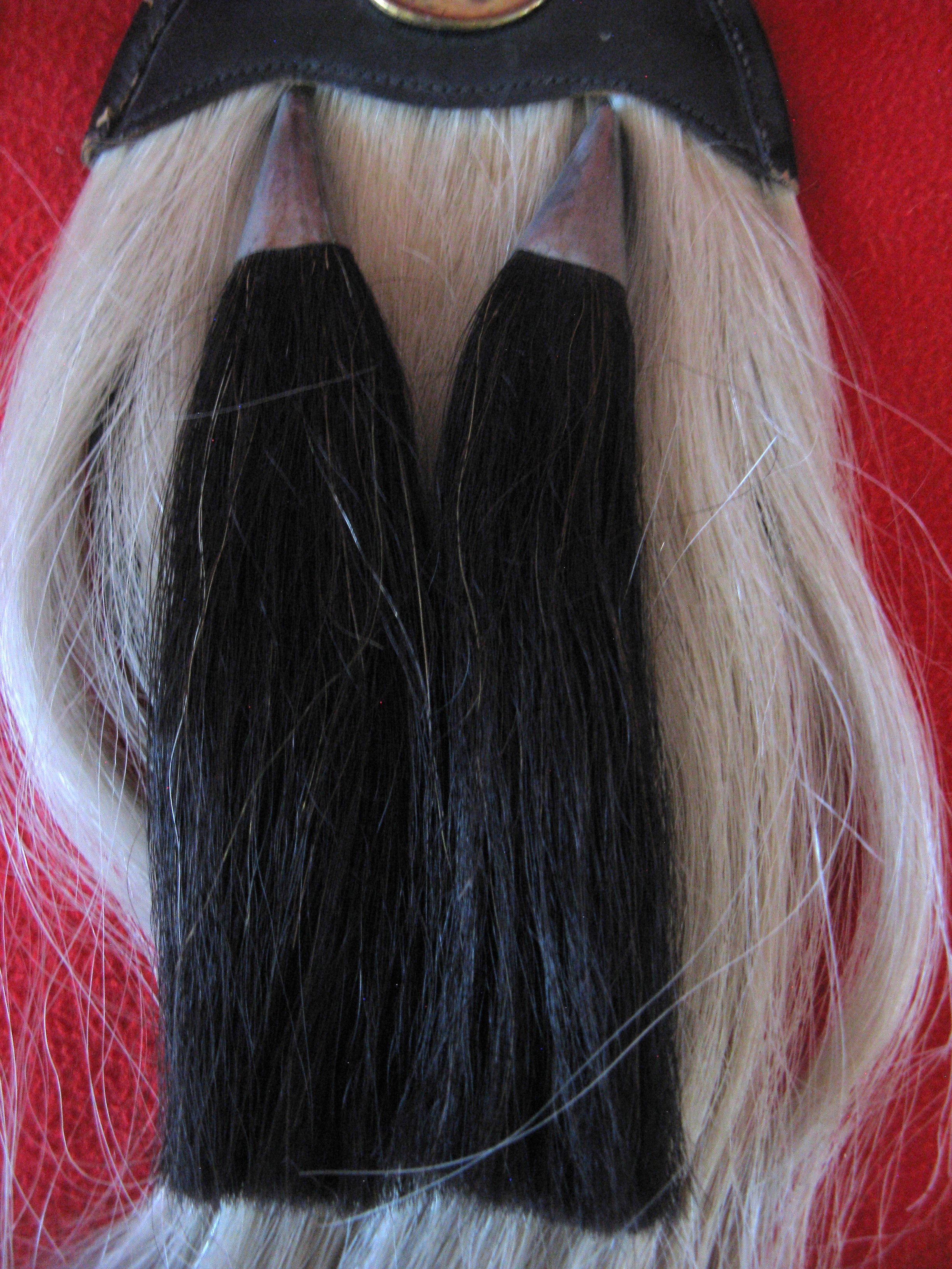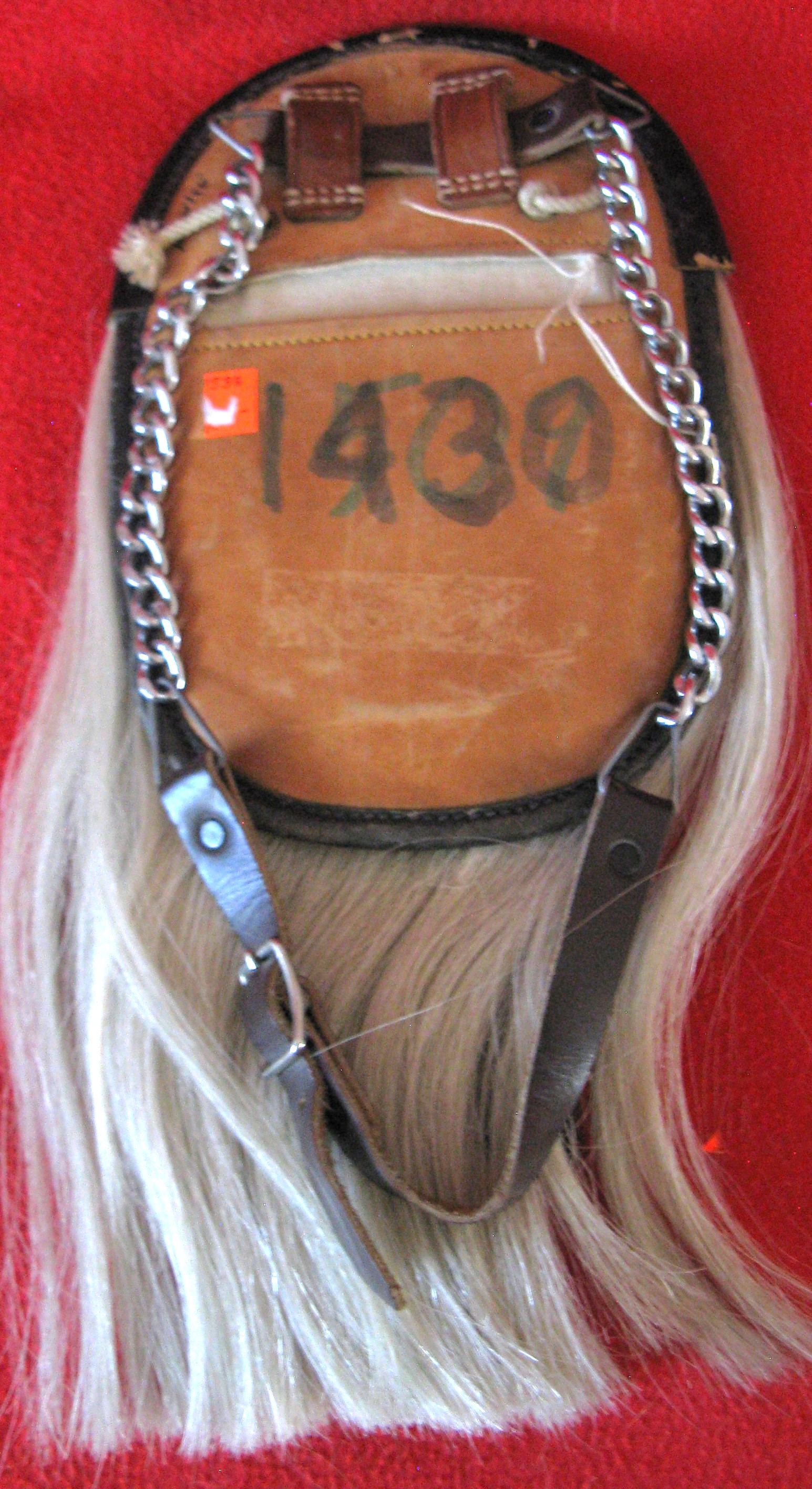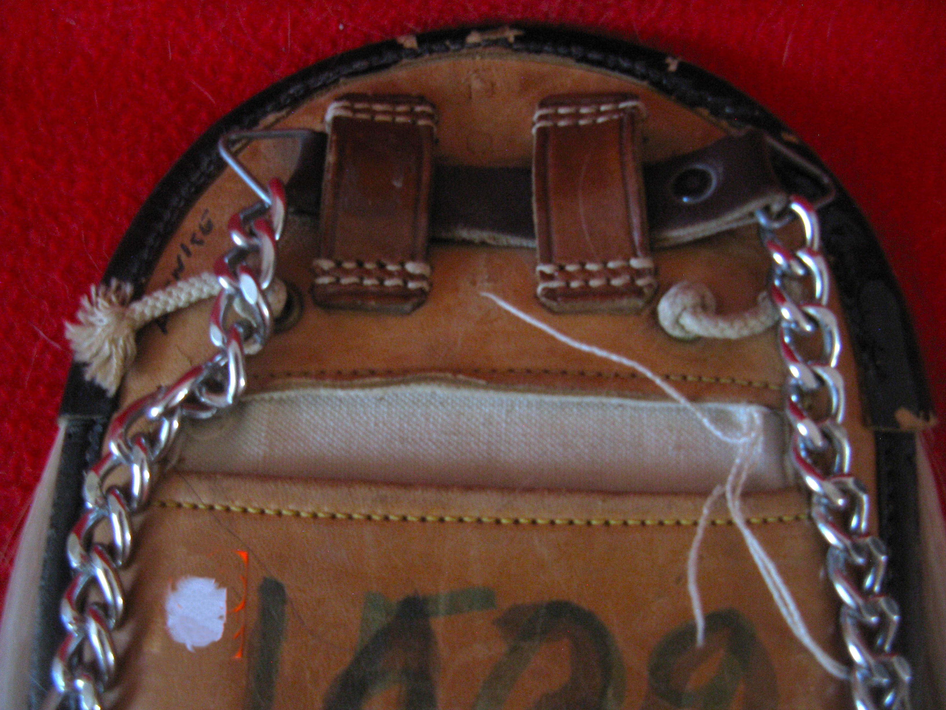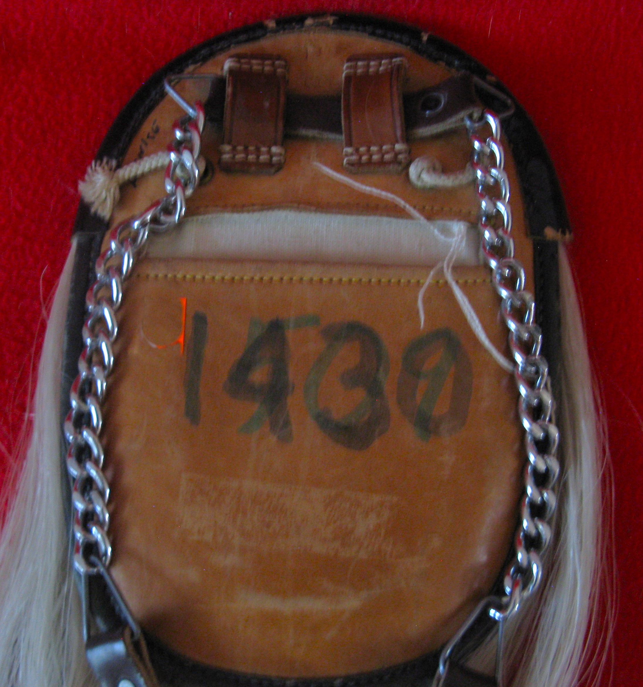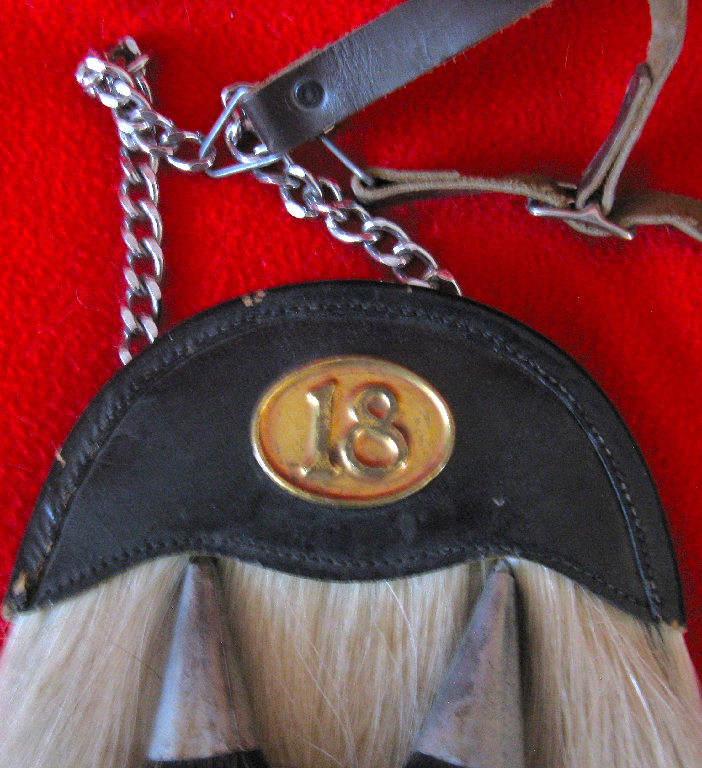 You are viewing a leather uniform sporran with two tassels. The badge is a number 18. The body of the sporran is made of hard black leather, and has a horse hair main body. It has an un covered opening for the pouch in the back of the badge, along with a number written over. The belt is of somewhat heavy chain with a leather buckle area. I have been told this is a Scouting sporran. A very clean and serviceable uniform accoutrement. View scans for details.