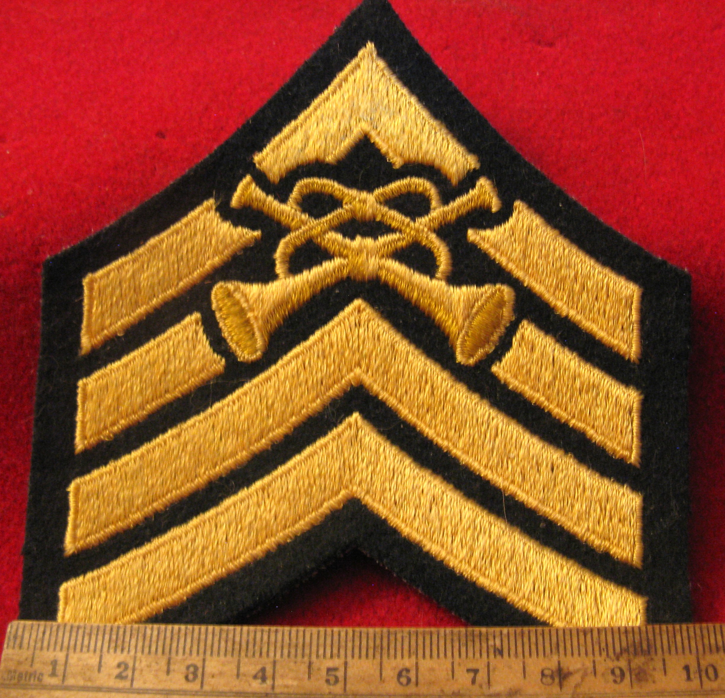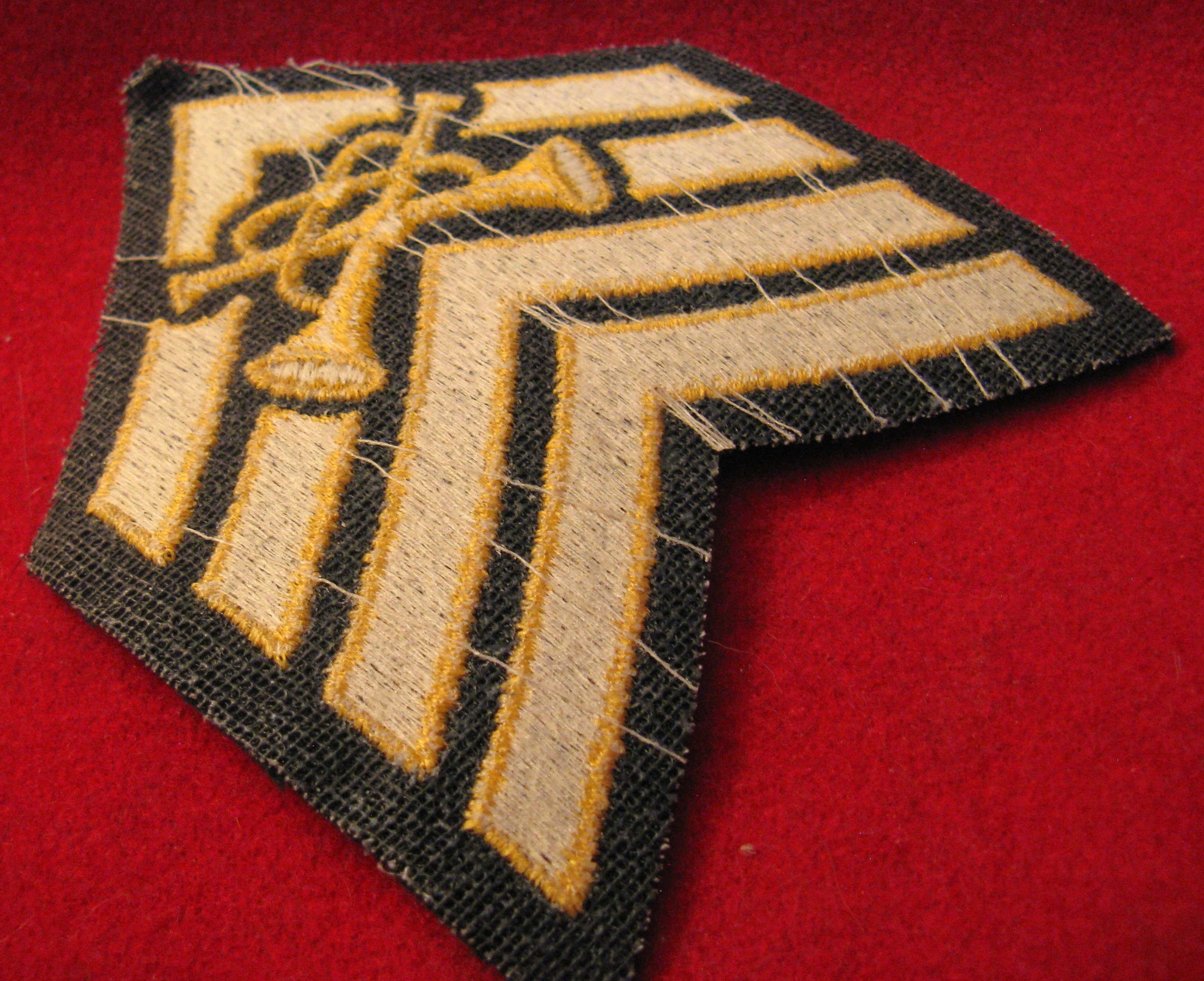 You are viewing a uniform rank of 1980's vintage. These Mounted police uniform insignia were made with gold colored embroidered thread. This one is still in excellent condition, never on a uniform, all on a plasticized backing. This one is a band related chevron.
