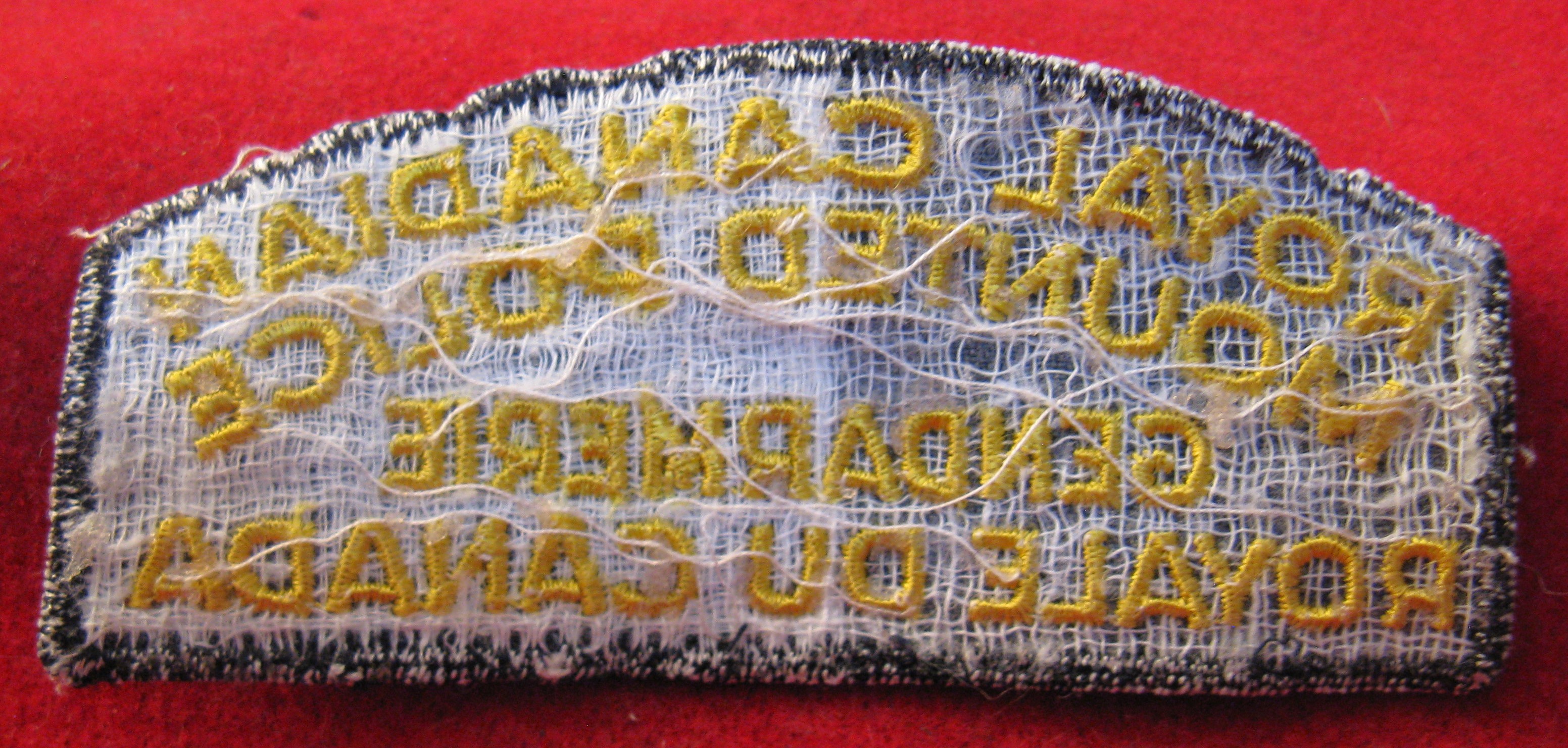 A 1960's vintage uniform shoulder flash in field used condition. This is the first edition of the bilingual badge. Gold embroidered lettering on a grey background with the typical period cheese cloth backing. Mostly used on the brown walking out tunic!