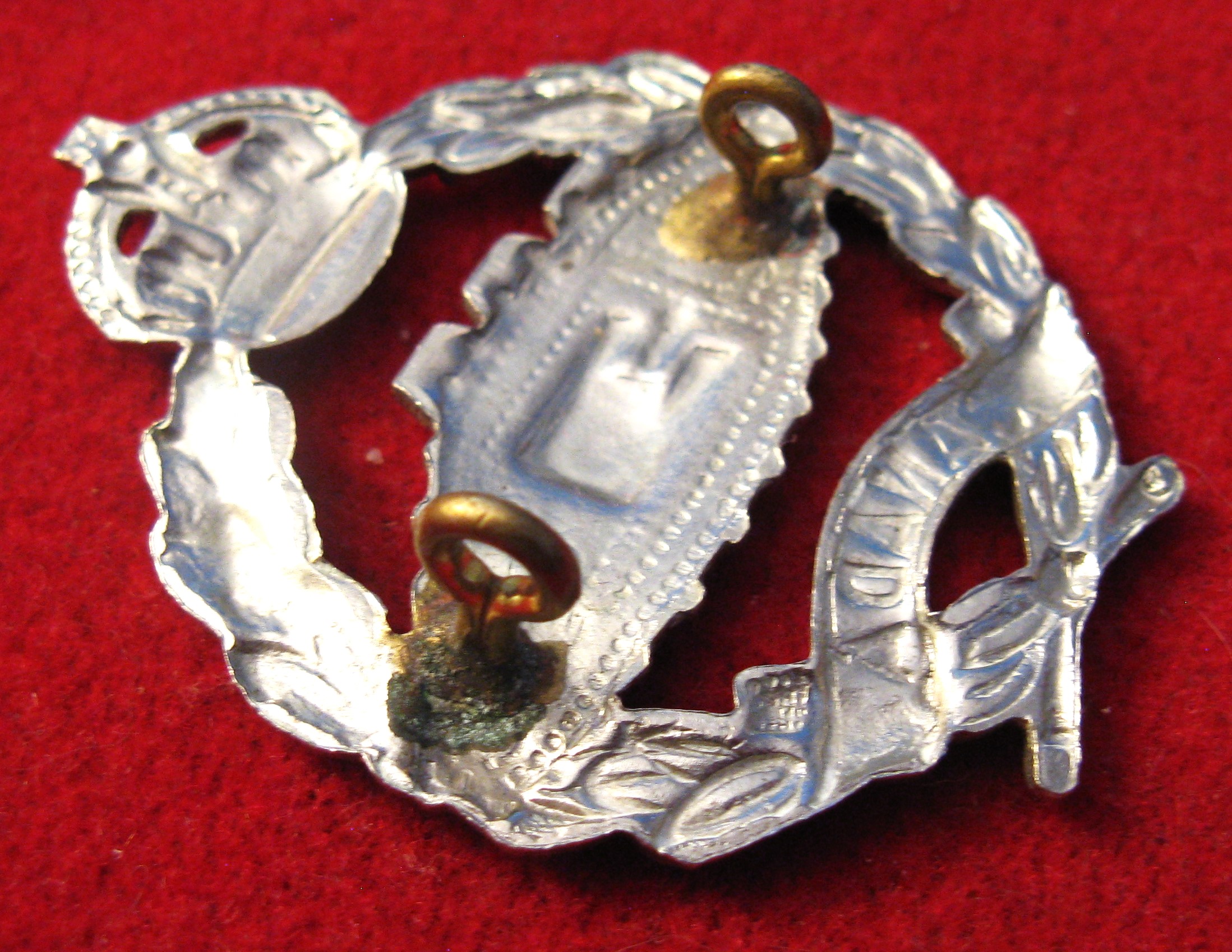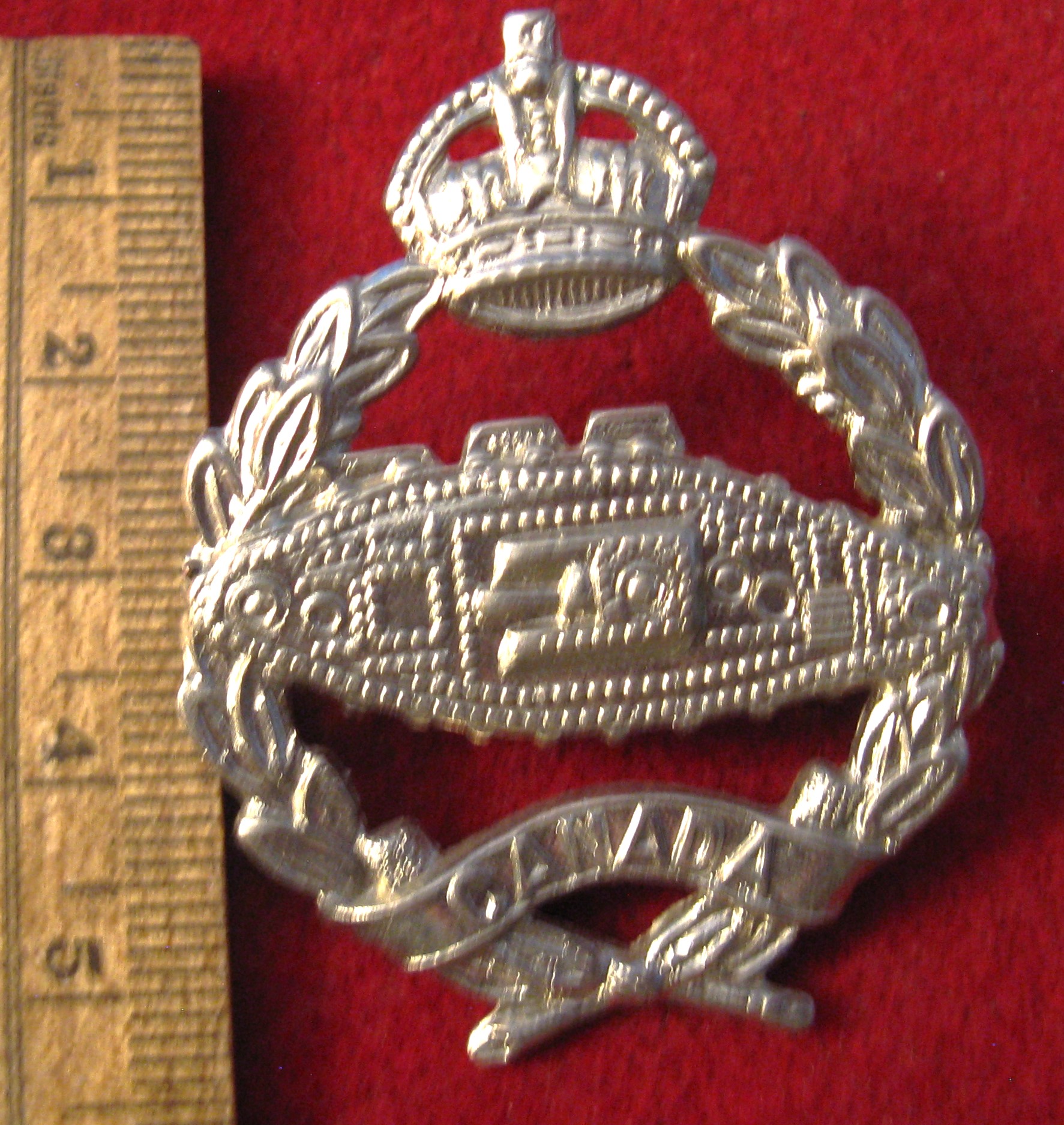 The scans above show a white metal cap badge for the Canadian Armored Corps. This badge was very similar in design to the British version, but note the "Canada" in the scrolling at the bottom. Made using the stamping method, and still in very good condition with original lug type fasteners in good order.