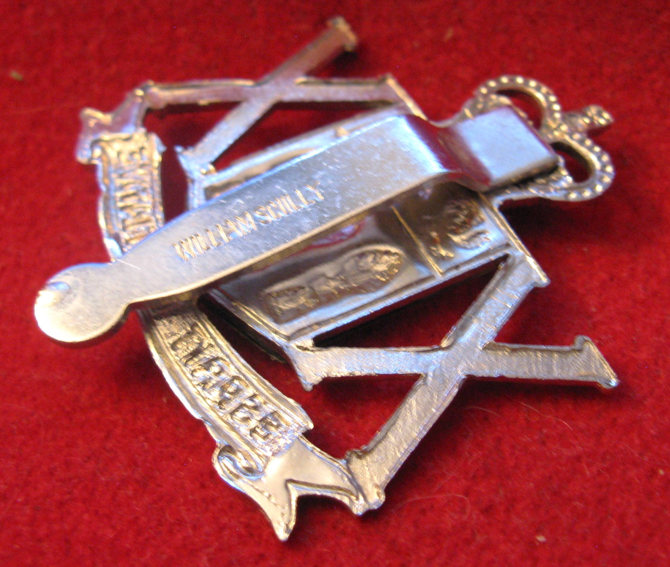 You are viewing the scans of a bi-metal (copper overlay on white metal) cap badge for the Saskatchewan Dragoons. The tang type attachment is in good order. This Note the hallmark on the tang ... "William Skully" . A well known Montreal based badge manufacturuer of the day.