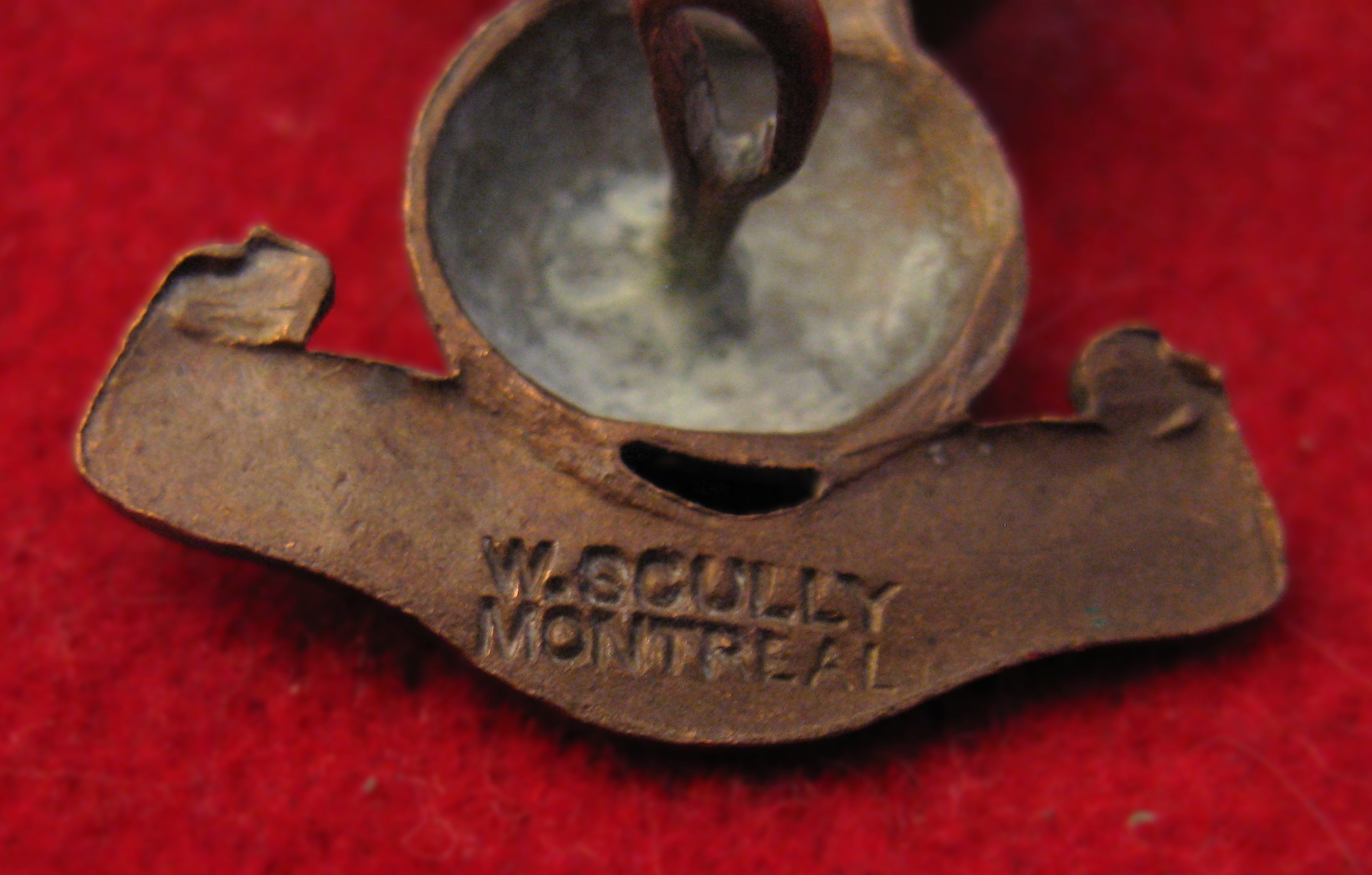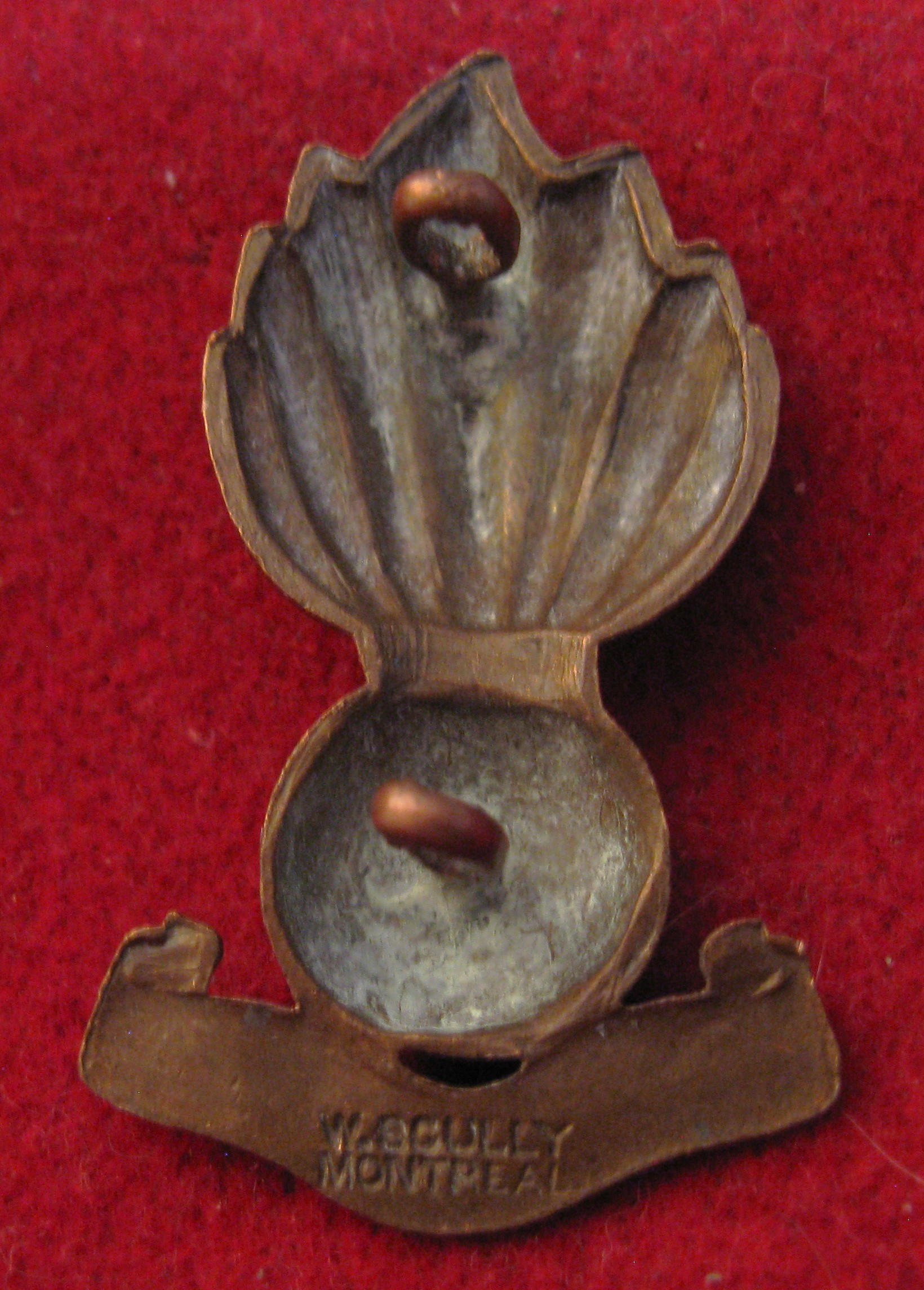 Above are the scans for this WWI era Canadian Field Artillery collar badge . A clean badge, made of brass, and comes with both vertical lugs original and in good order. View the clear "WM Skully" hallmark at the botton on the obverse. Note the distinctive Canada Scroll at the bottom as well. In WWII this was replaced with motto "UBIQUI" ... meaniing everywhere.