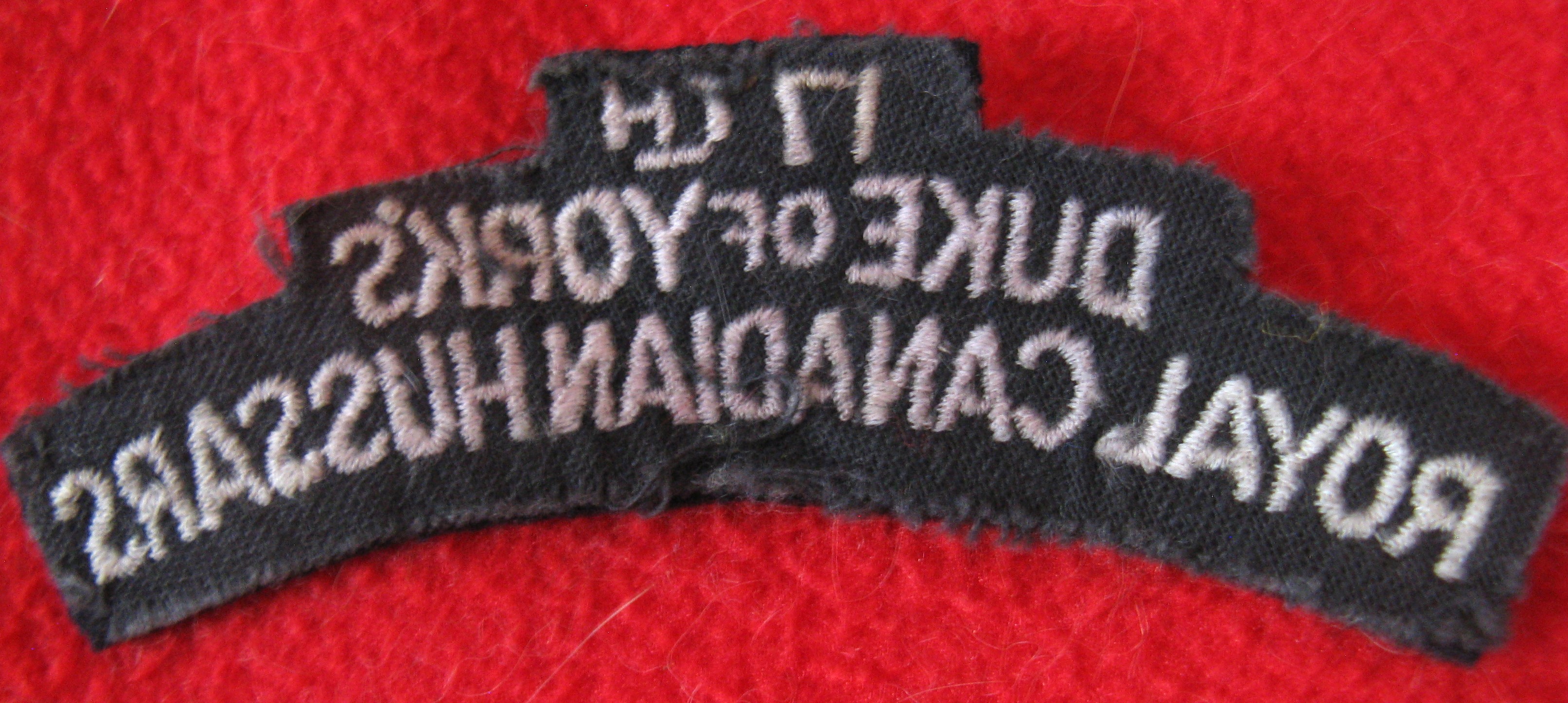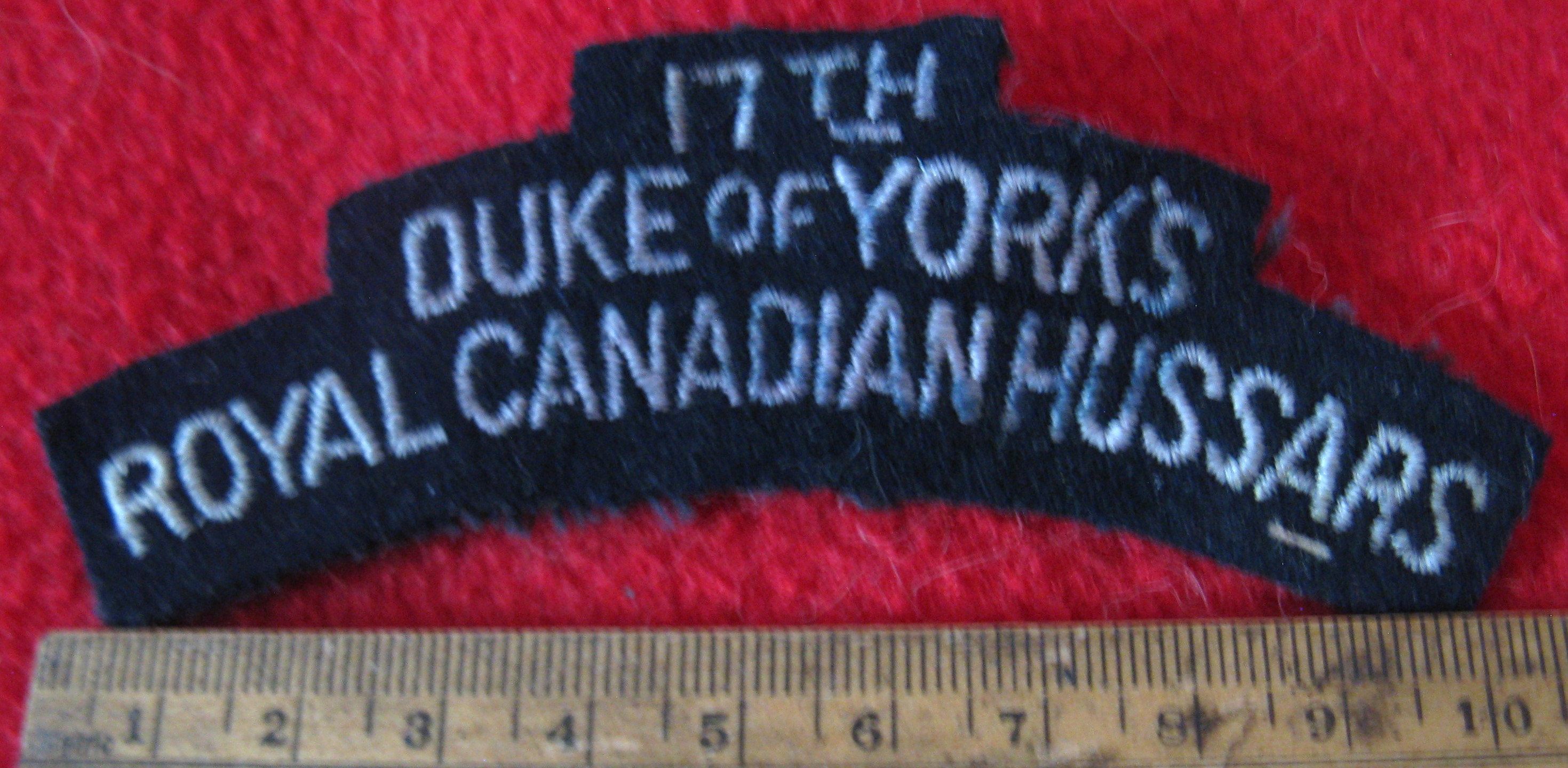You are viewing the scans for a WW2 era 17th Duke of Yorks Royal Canadian Hussars. Very good condition, Still intact after all these years. Has a black cheesecloth backng on embroidered dark blue felt.