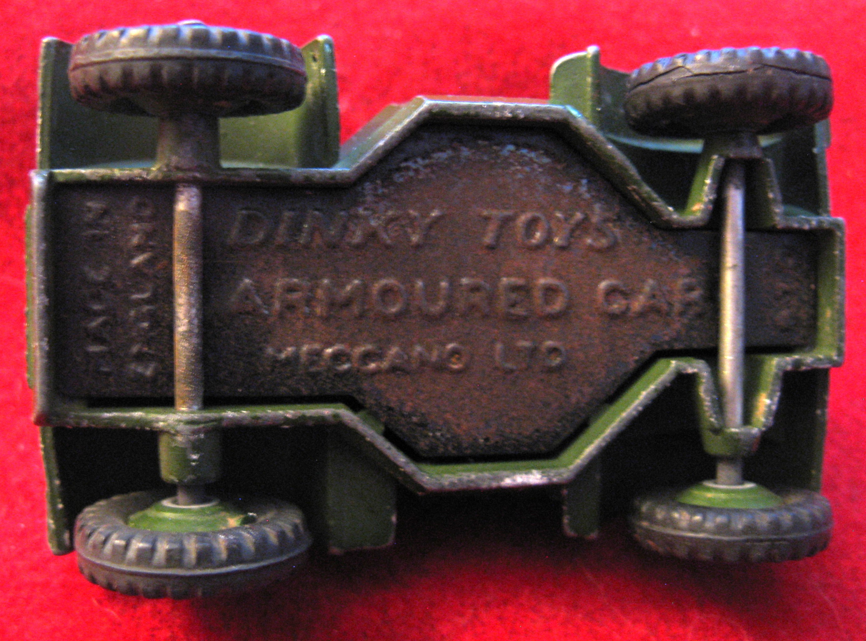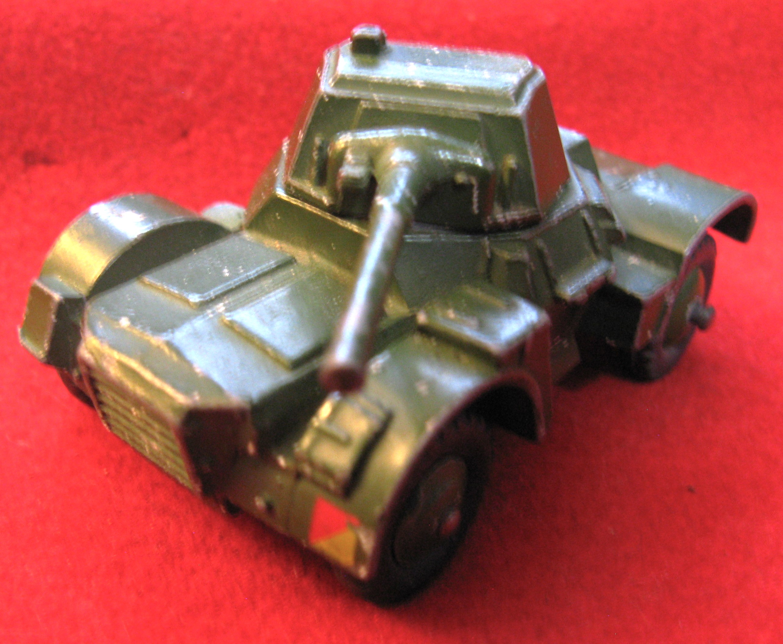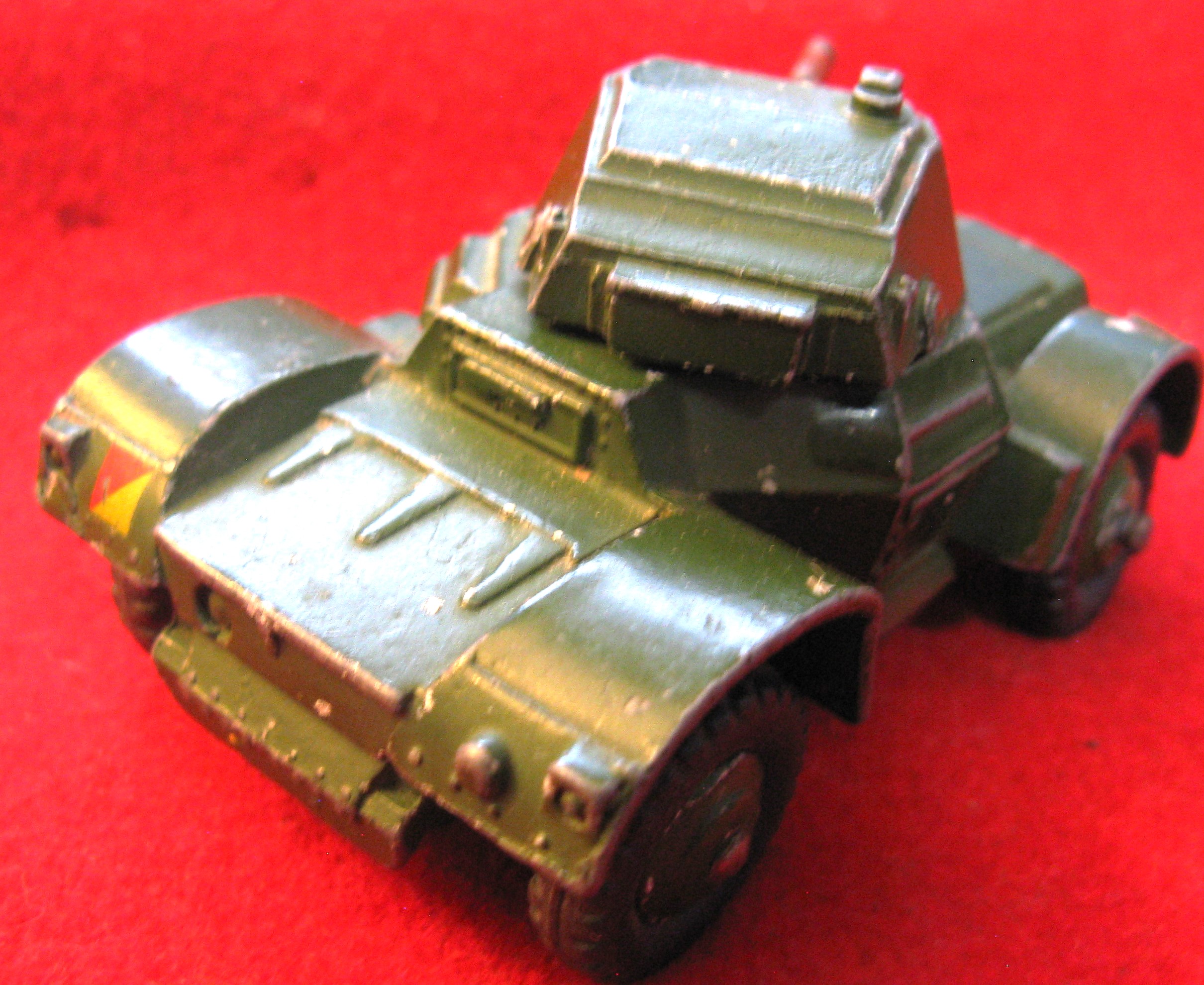 You are viewing a vintage Dinky brand Armored Personel Carrier. Made in England by the Meccanno company. Nicely preserved and still quite functional.Turret turns nicelt and all the rubber is in good order. No flats here! Overall length is about 7cms. Paint has some minor edage wear, mostly on the gunbarrel, but still nice. It is a heavy well made small military toy of WWII vintage. View Scans.