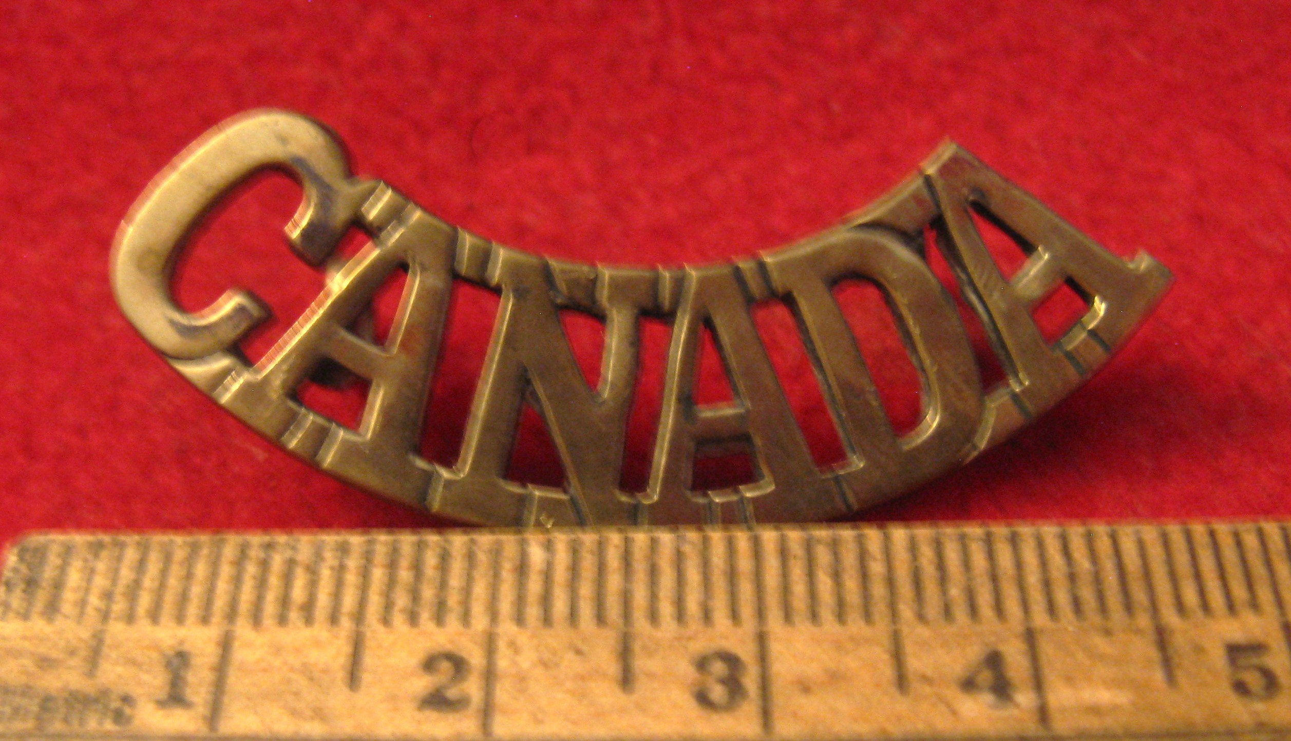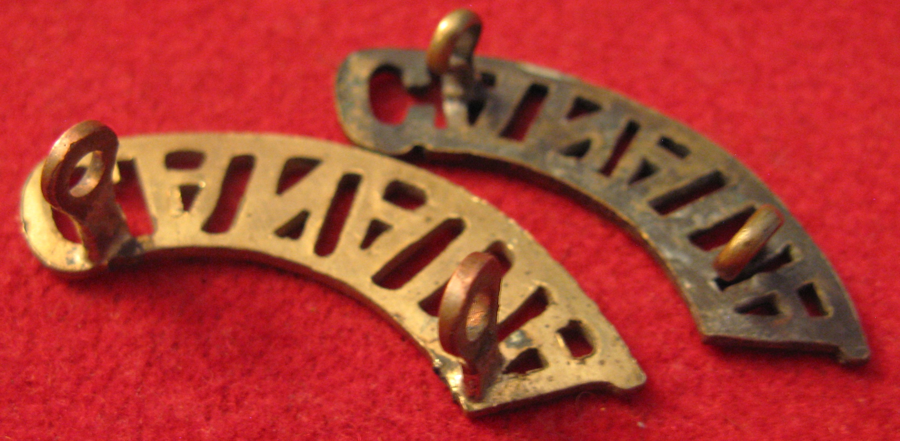 Above are the scans for this WWI era set of moderately curved "Canada" shoulder titles. They come with all horizontal lugs original and in good order. An excellent solid brass set, but with more of a curvature than the other sets listed.