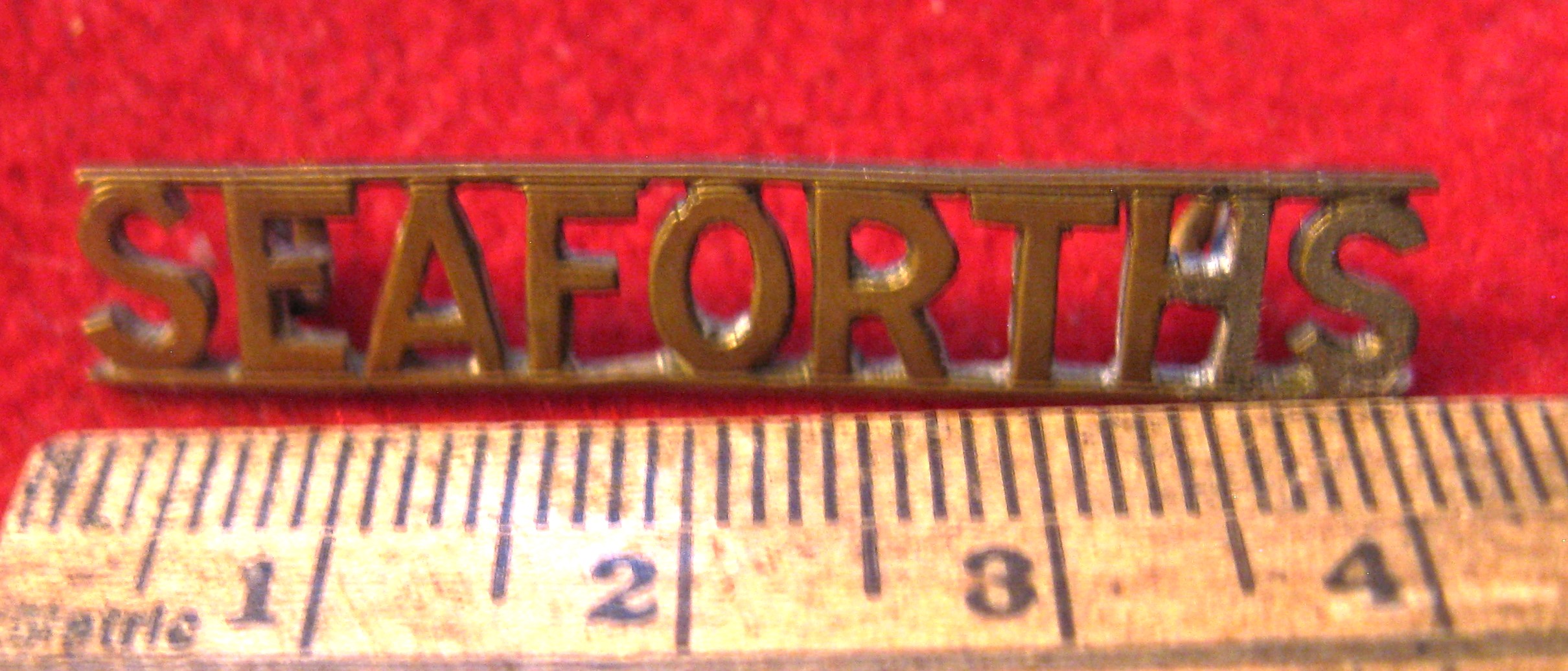 You are viewing a vintage WWII era single "Seaforth" shoulder title... Made of brass with both lugs original and in good order. Smaller size lettering, about 0.8 cm. View scans for details.