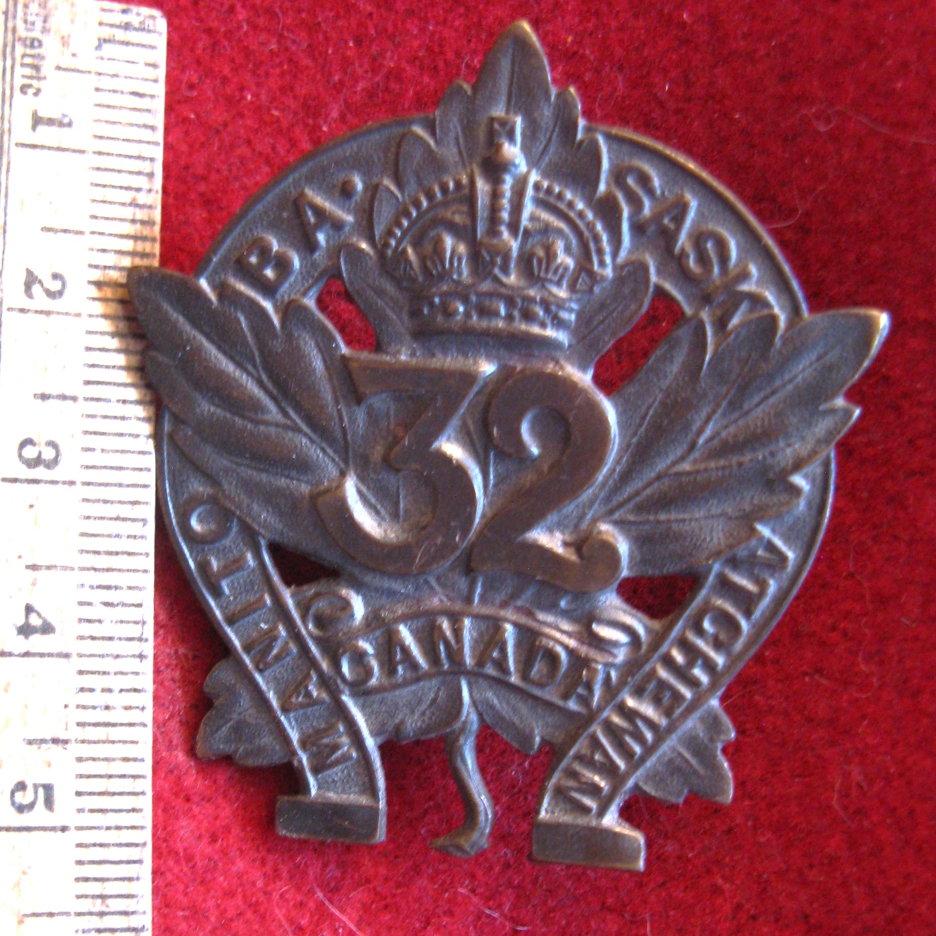 Above are the scans for a WWI 32nd Battalion collar badge. The lugs on this oneare in good usable order. An o/r clean age darkened copper badge with very nice patina.