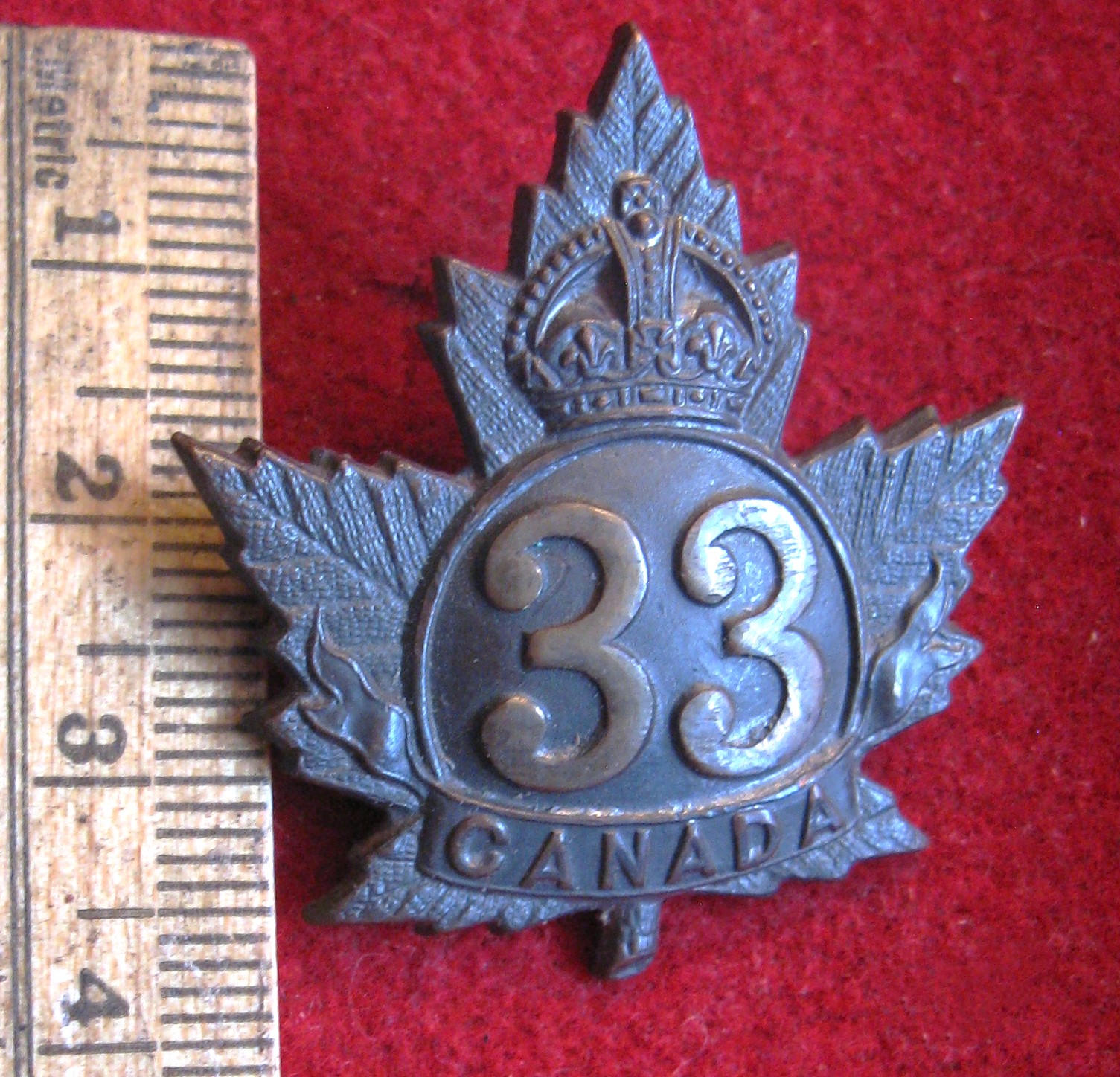 Above are the scans for a WW1 33rd Battalion cap badge. The lugs on this one are in good usable condition. A o/r clean browning copper badge with very nice patina giving evidence to its age.