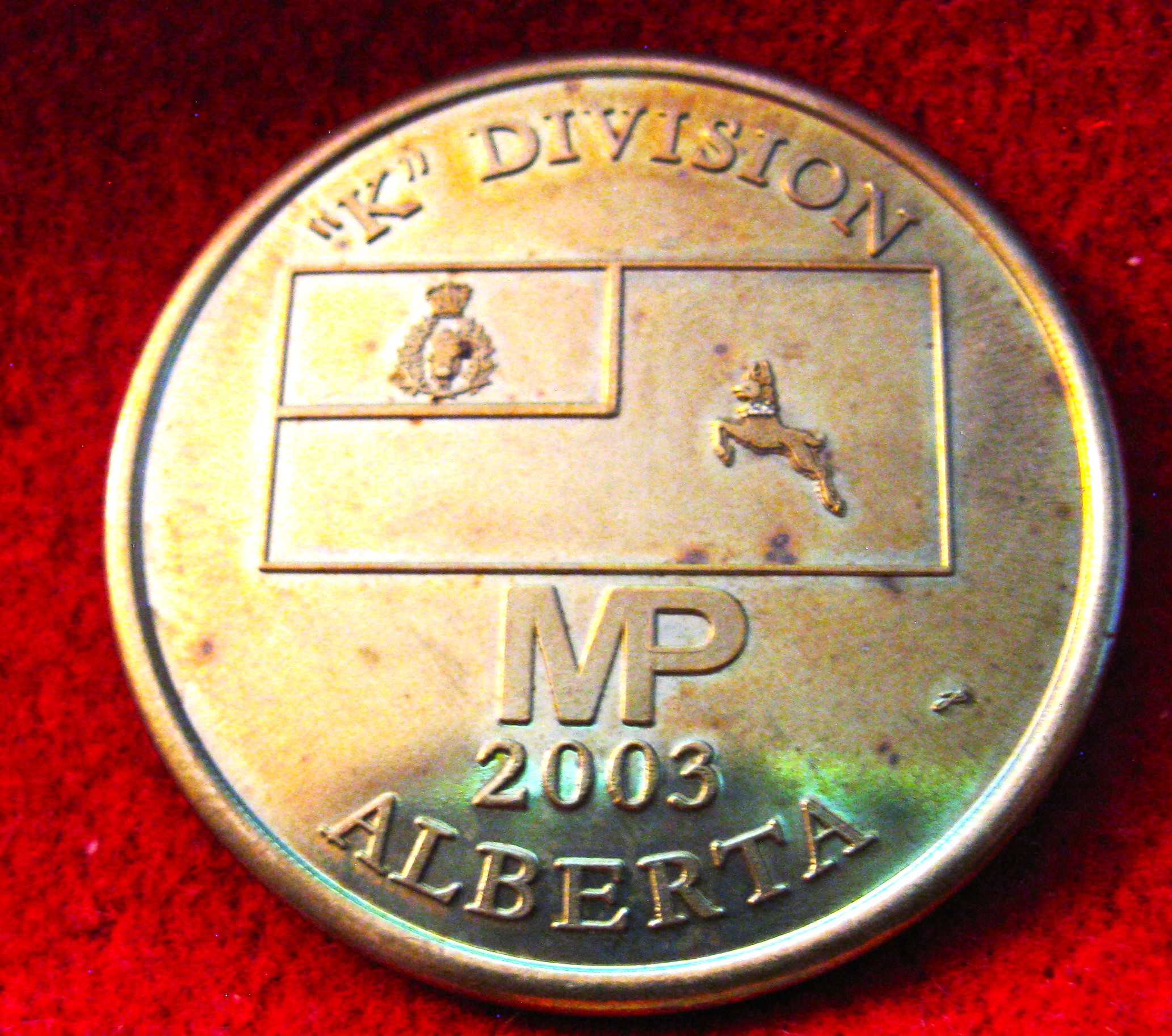 Above are the scans of this large brass Mounted Police challenge coin. Still in perfect condition with no scratches or wear marks, just the mere beginnings of age patina. Has a small sized emblem on the shiny brass face, just below the name "Commanders Coin", the inscription along the bottom reading "In Recognition of Excellence" . The obverse show the flag and lettering of "K Division, and is dated 2003. View scans for details.