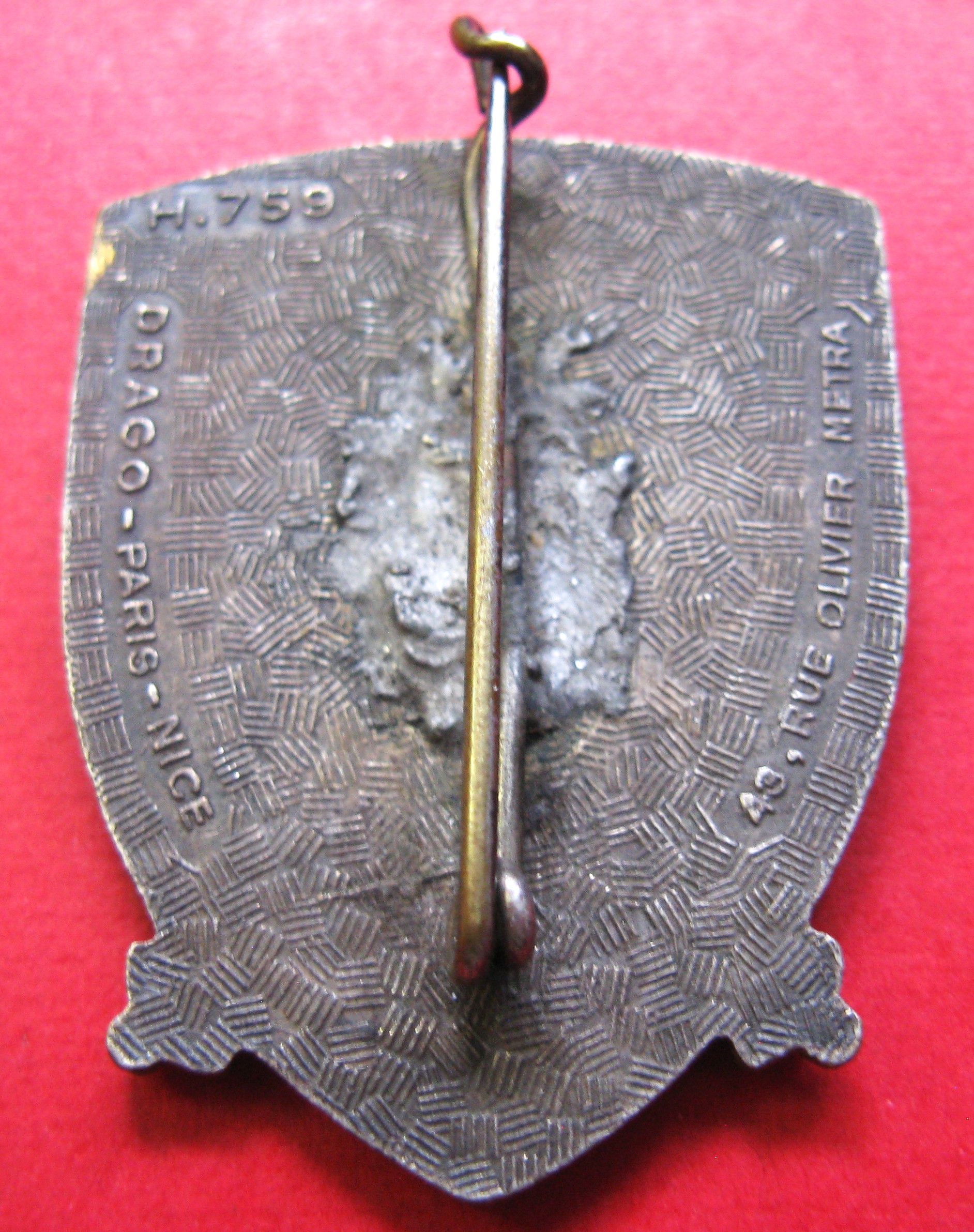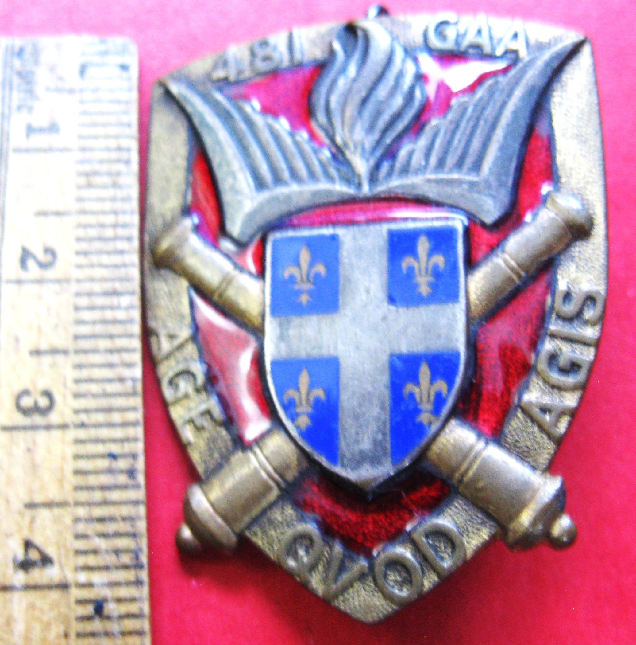 This is an interesting badge related to the 481 GAA French Army. Made of a heavy white metal. Has an enameled shield at the centre, with 4 fleur de lys in blue enamal over top of crossed cannons, all reating on a sea of red enamaling.Just beautiful! Has a motto around the sides and botton of the badge. "AGE QUOD AGIS" ( probably latin) The badge itself has a repaired straight pin style attachment. It is hallmarked "Drago ... Paris ... Nice". (Most likely WWII era). Don't know much more about it though???