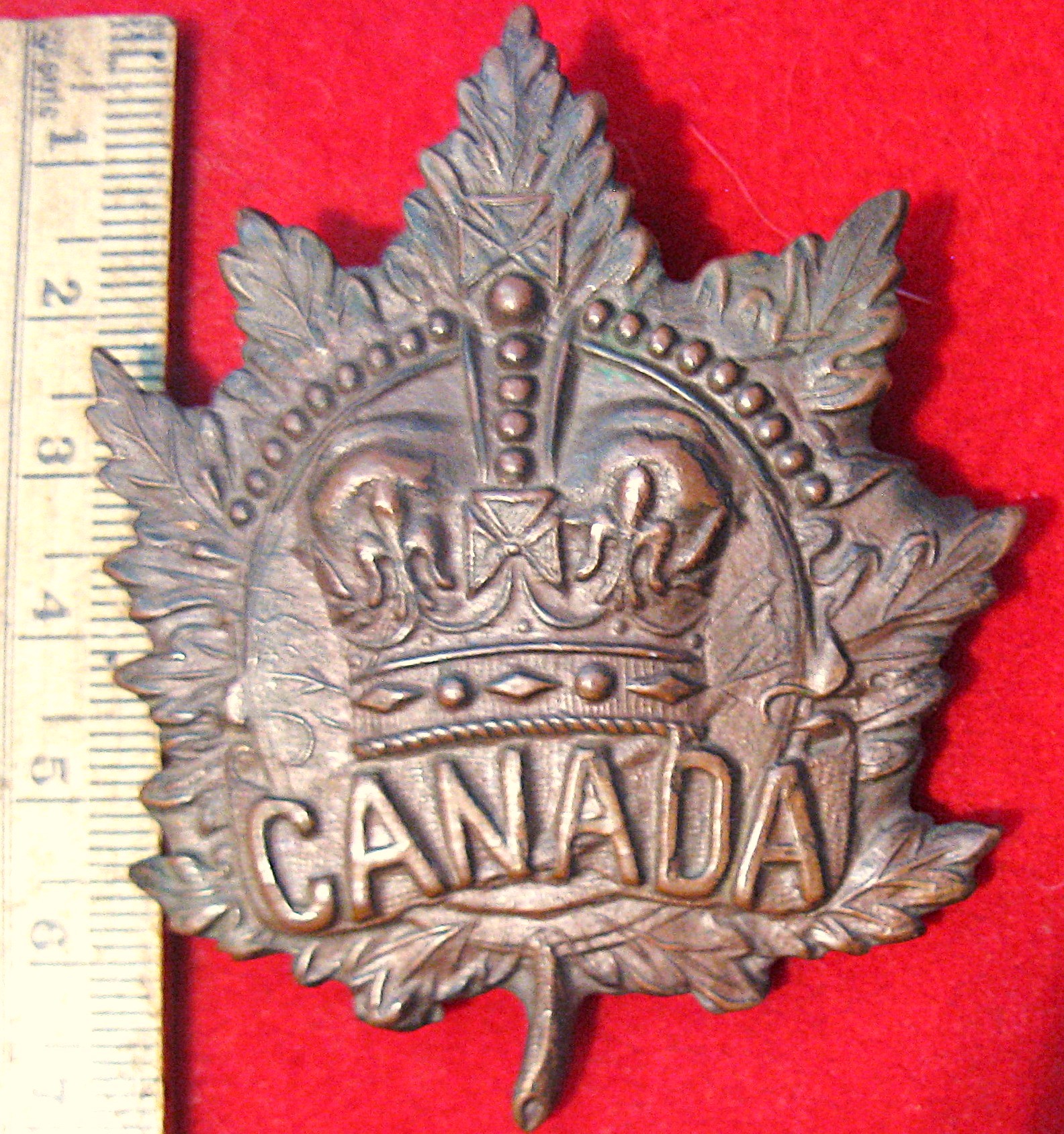 You are viewing a large copper helmet badge (approx 6.5cm long) for the Canadian contingent that served, most likely, in South Africa during the Boer War era.. This badge has a Victoria crown and small lugs. A exquisit relic from the days of a bygone era, with all original lug type fasteners intact and in good order. A rare find among Victoria era cap badges.