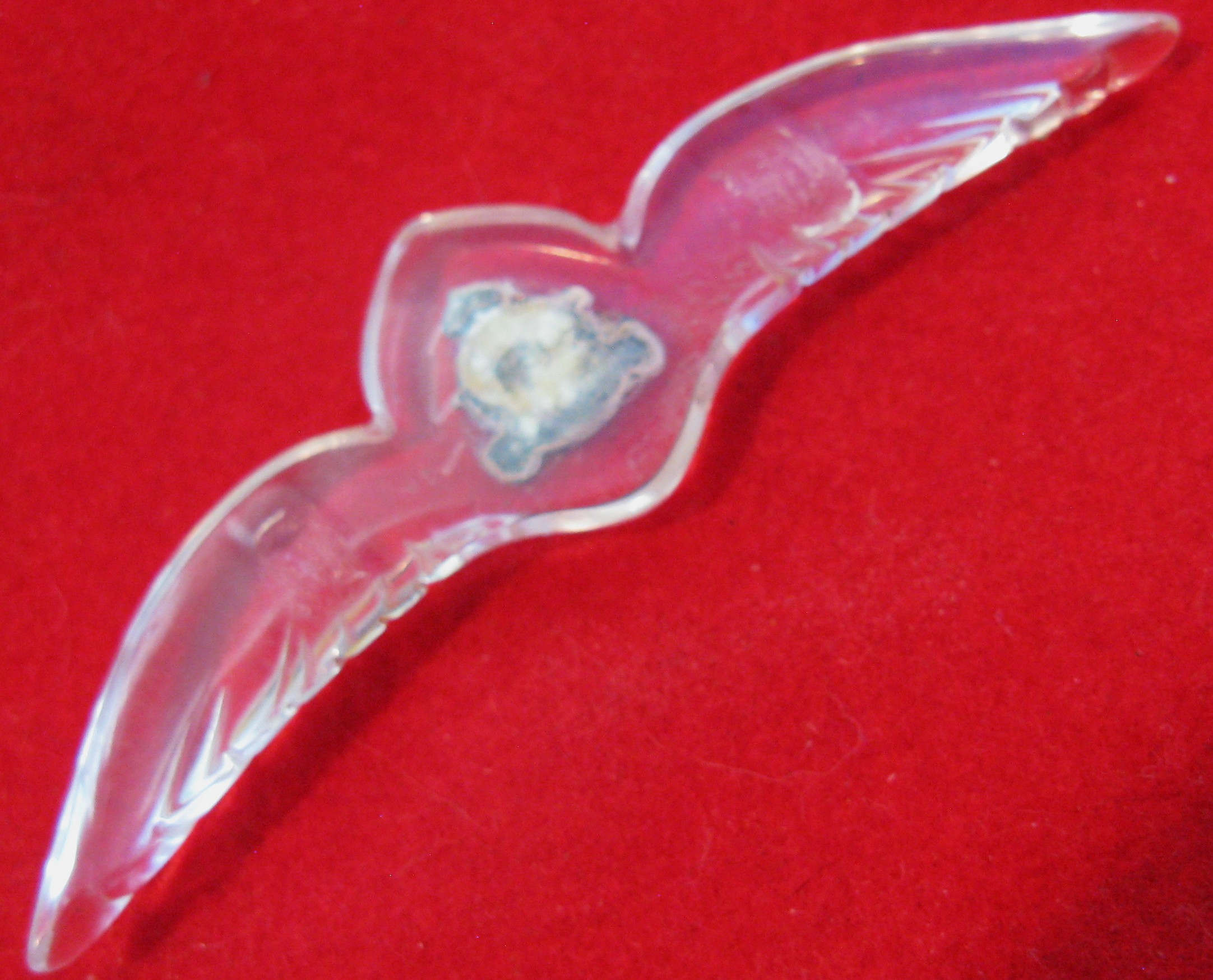 You are viewing a WWII era sweetheart pin. It is made of clear celluloid material, in the shape of the WWII unifrom cloth badge used on the uniforms. It has a small RCAF insignia inserted into the celuloid material. Some have concluded that these pendants were made from the material used for the cockpits of the WWII aircraft. The really unique feature of this sweetheart pendant is its wing shape. This item is still in excellent condition for its age, except the attachment device is missing. View scans for details.