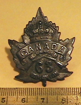 BelowYou may view the scans for a WWI63rd Batallion cap badge. Formed in 1915. This battalion was raised in Alberta, with headquarters in Edmonton. Sailed for England inApril of1916, in the Great Canadian Armada,and was later absorbed into the 9th Reserve Battalion. This beautiful example is complete with both lugs. A clean "pickled brasso/r badge with very nice patina giving evidence to its age. A beauty for any collector of Canadian CEF badges. Guaranteed 100% genuine. Please keep in mind that on all our products we accept prepaid authorized returns within 14 days of shipping, for full product credit, if you are not satisfied. We can accept any currency but prefer US$ which is what our items are listed in. I will give exchange rate based on my current bank foreign rates. We can accept Paypal. Notethat you must assume responsibility for loss in shipping if you decline the insurance. I can combine items for multiple buyer.