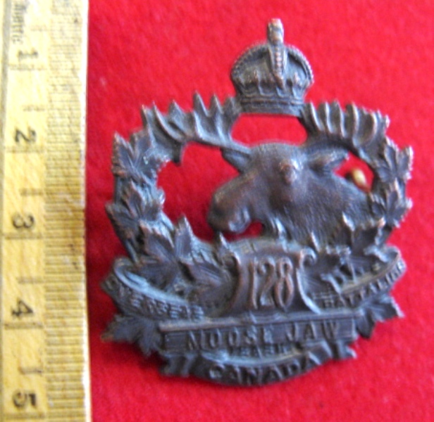 Above are the scans for a WWI 128th Batallion cap badge. Formed in 1915. This battalion was raised in Saskatchewan, with headquarters in Moose Jaw. Sailed for England in August of1916,and was reorganized into the15th and 19th reserve Battalions. This beautiful example is complete with both lugs. A browning copper o/r badge with very nice patina giving evidence to its age. Maker marked H.J. Inglis. A beauty for any collector of Canadian CEF badges.