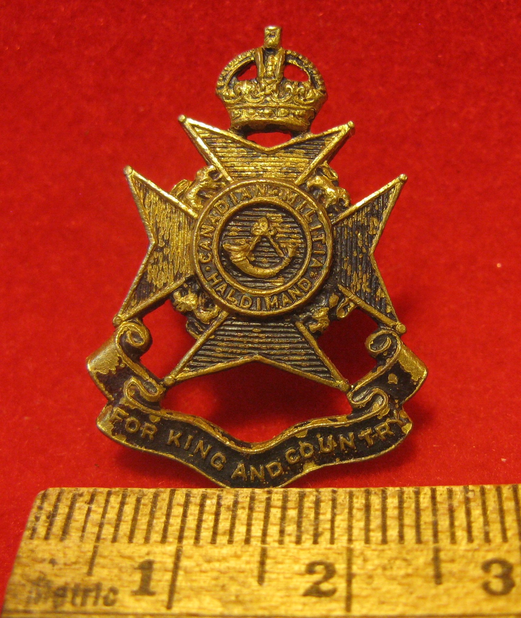 You are viewing an Edwardian era collar badge of the Haldimand Militia Regiment from Ontario. It is a clean badge that had been blackened at one time for service needs. The welded stem lugs are original and in good order.