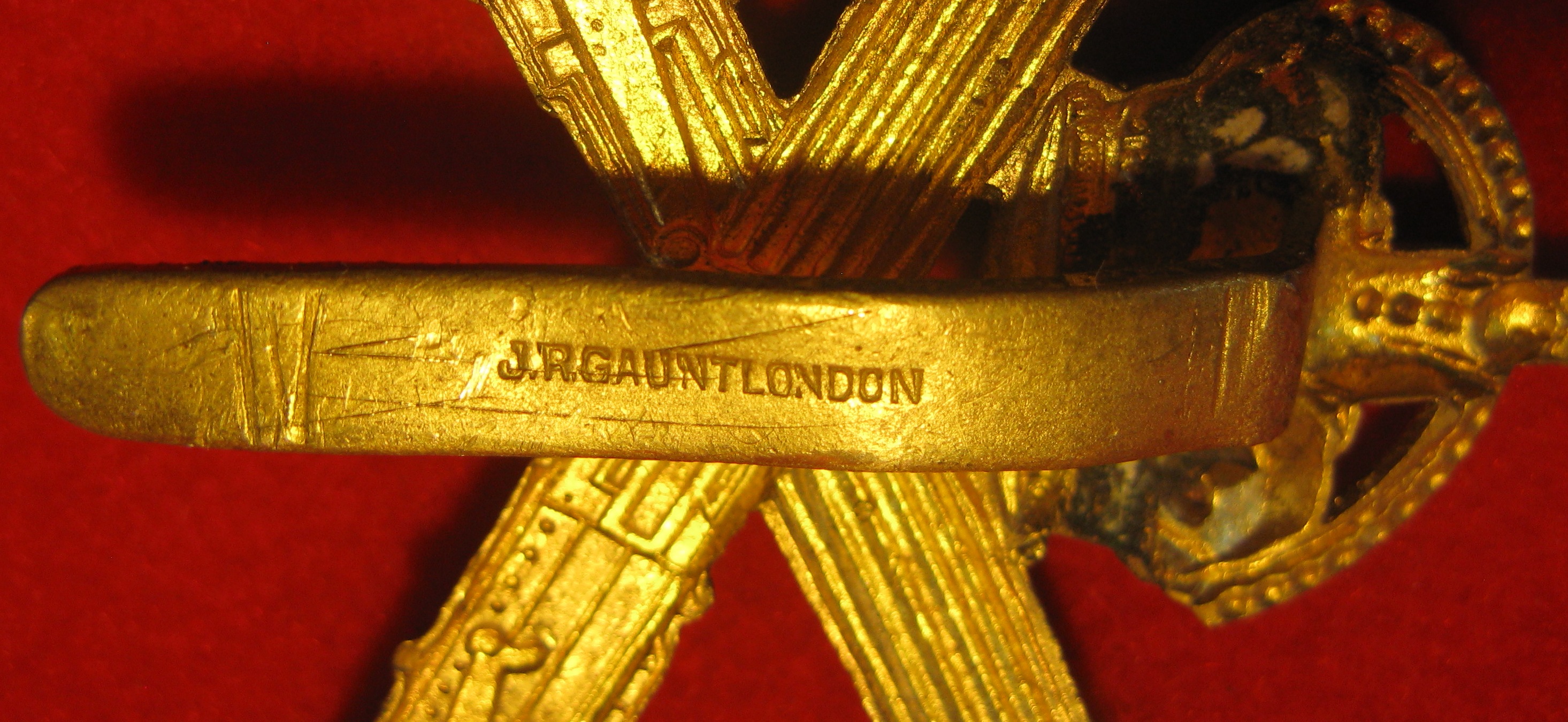 Here is a nice clean WW2 (KC era) Machine Gun Corps Badge. It has its tang attachment in good condition. It appears to be made by a stamping method but with excellent detail on the design features. Not sure if it is British or Canadian in origin, but still a very clean browning brass badge. Hallmarked "J.R. Gaunt London"