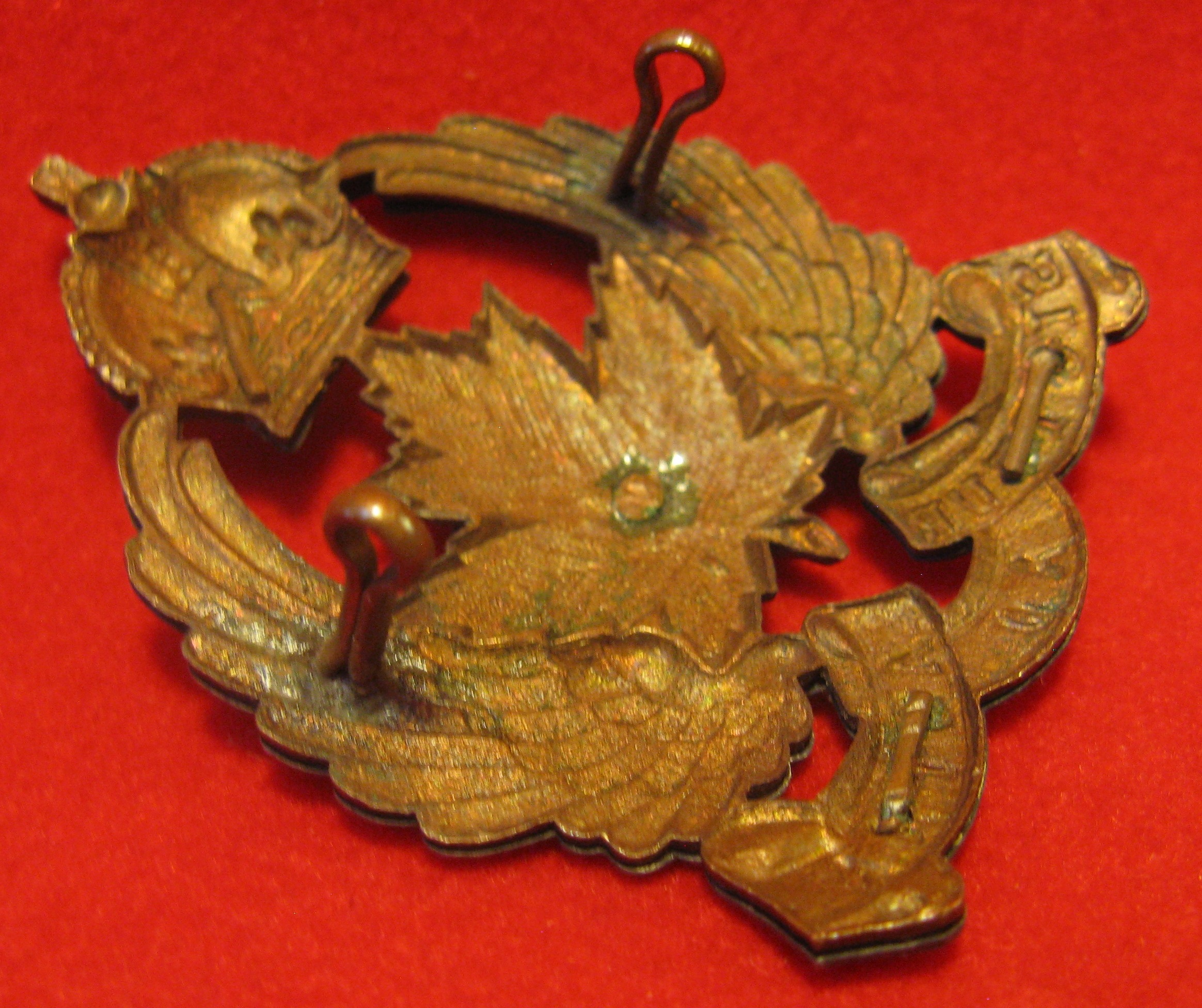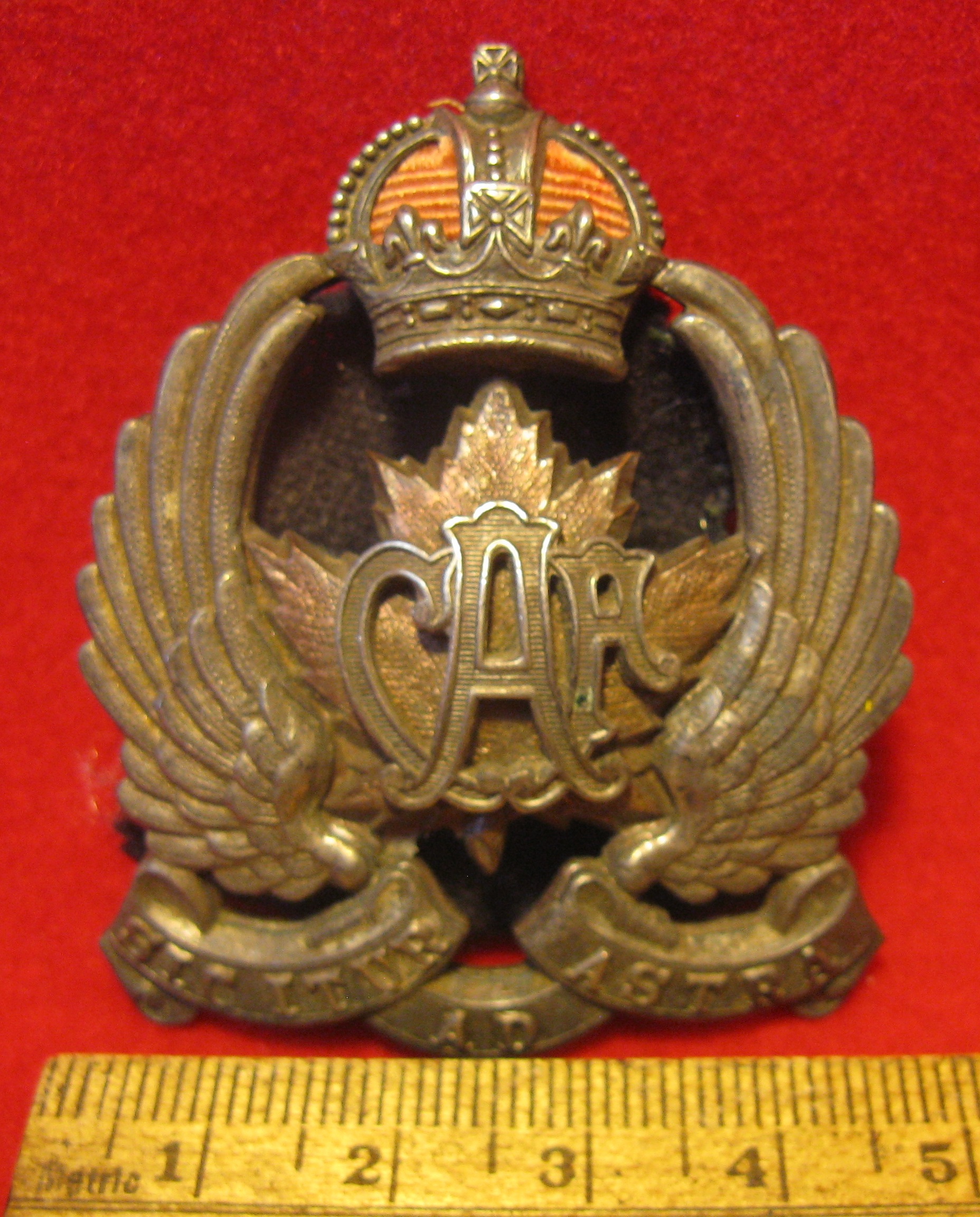 This a another pattern of this rare type of Canadian Army Airforce cap badge of 1920's vintage. Note how the wings of this specimen are connected to the crown. A much sturdier construction than the other format. Has CAA over copper leaf. This beautiful badge, whose unique design bespeaks of the hopeful times during which it was made and used briefly before the Canadian Air Force was established, just after the end of WWI. Only used until 1922...