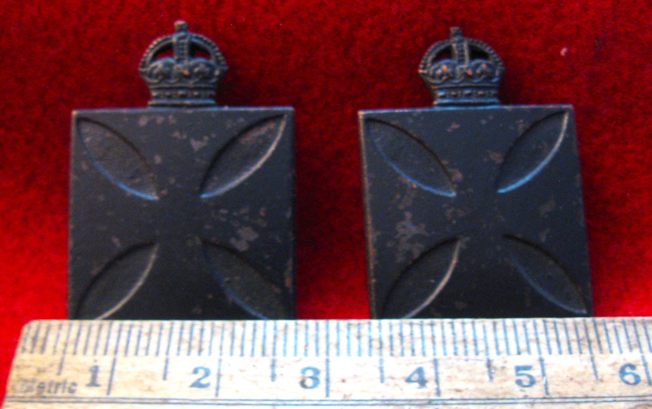 Above are the scans for a set of two WWI non-voided collars for the Canadian Army Chaplin's Corps. These examples have been blackened (perhaps an early attempt at camouflage), and is not uncommon with these badges. Good condition, hard to find, with all lugs, but one, present. This beautiful set is clean, with maker mark (see scans). A beauty for any collector of Canadian CEF badges.