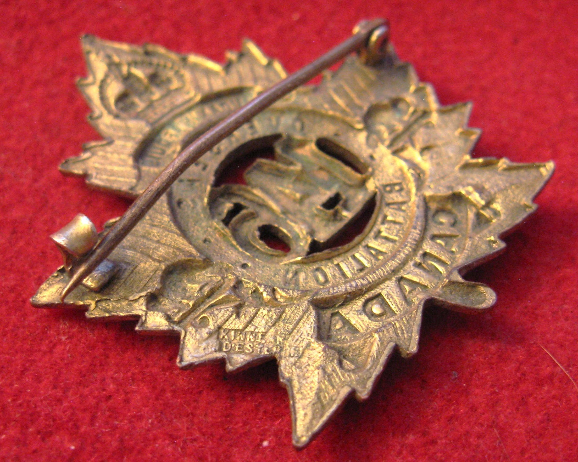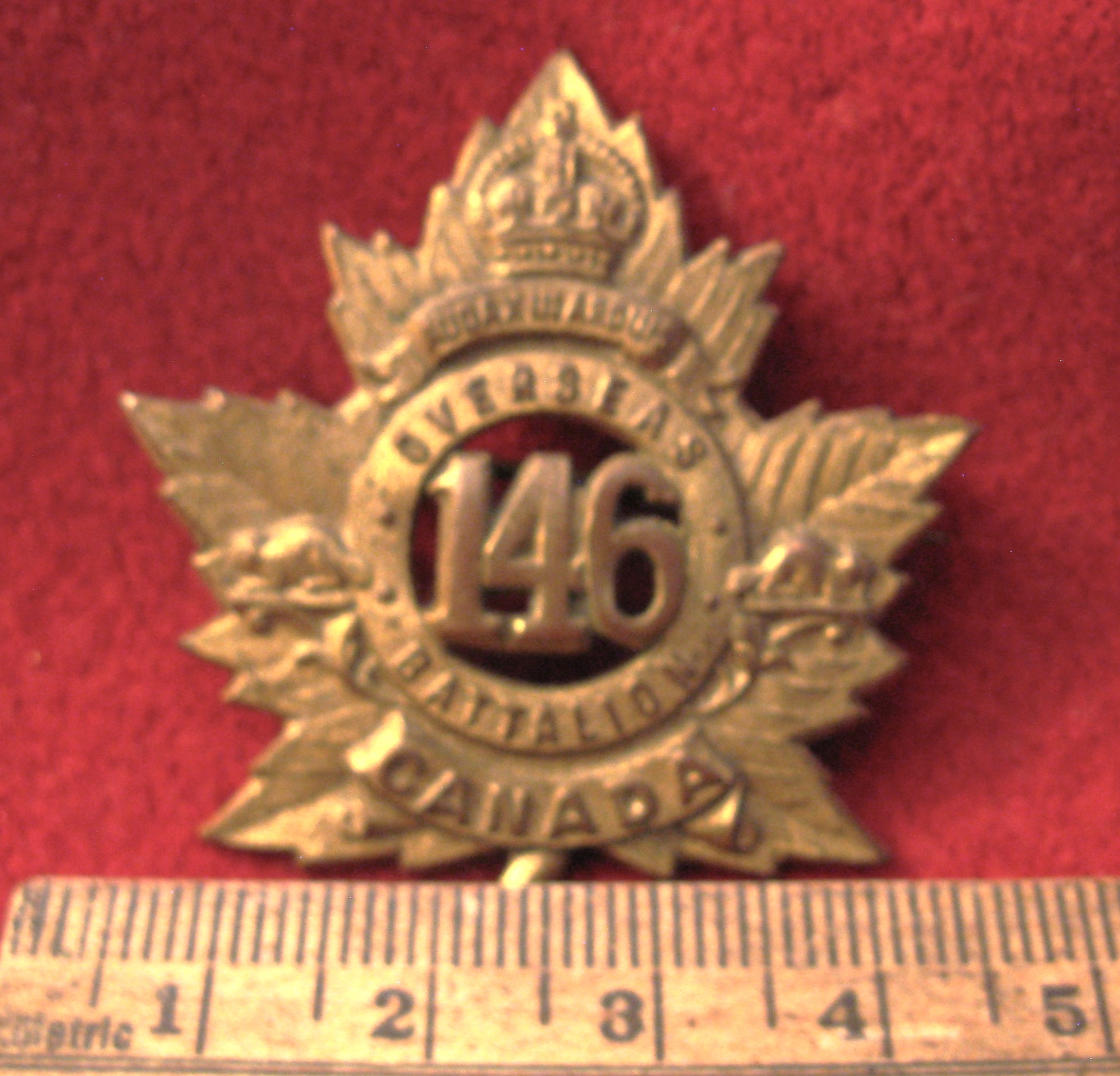 Above this note are the scans for a voided version of this WWI 146th Batallion cap badge. (Brass composition) This badge has a straight pin attchment denoting that the badge is officer grade or a sweetheart version. Formed in late 1915. This battalion was raised in Southeastern Ontario, with headquarters in Kingston. Sailed for England inSeptember of 1916, and was inserted to resupply the 12th Reserve Battalion. This beautiful example is complete with a functioning cross pin. A clean hallmarked brass badge with nice age patina. A beauty for any collector of Canadian CEF badges.