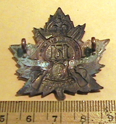 Above are the scans for this WWI 171st Battalion cap badge. (Copper composition) Formed in 1916. This battalion was raised in Quebec, with headquarters in Quebec City. Known as the "Quebec Rifles". Sailed for England in November of1916,and was used to resupply the 148th Infantry Battalion, the 5th Pioneers and the 20th Reserve Battalion. This beautiful example is complete with both lugs. A clean copper o/r badge with very nice patina giving evidence to its age. A beauty for any collector of Canadian CEF badges.