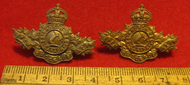 You are viewing a lot of two rare collar-dogs from the 33rd Huron Militia Regiment. These badges are made of copper and good condition with all original lugs present and in good order.