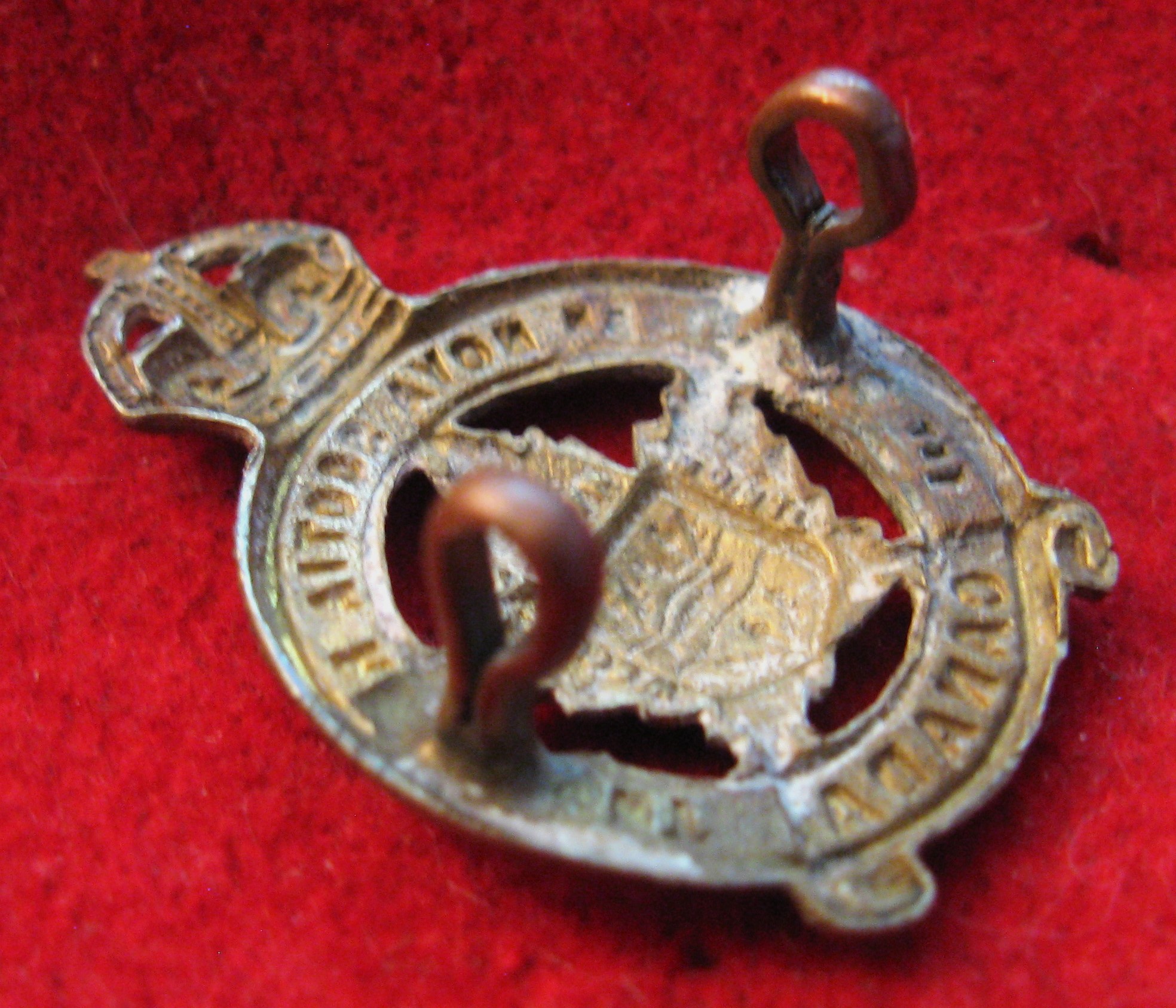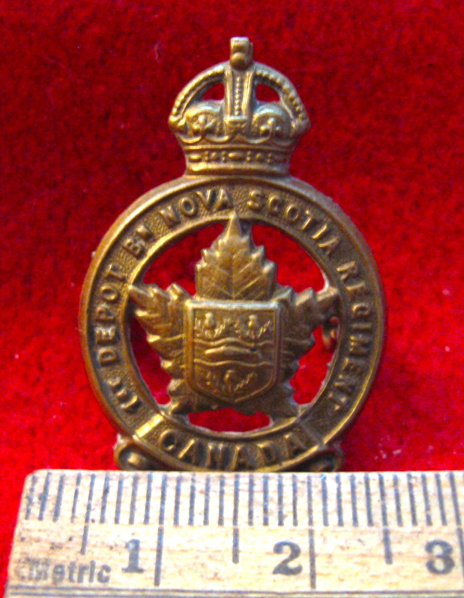 Above are the scans for this CEF Depot Battalion collar badge made of brass. Known as the 1st Depot Battalion, Nova Scotia Regiment, with headquarters in Halifax. This badge is all complete with both original lugs, in good order. An o/r brass piece with very nice patina giving evidence to its age. A beauty for any collector of Canadian CEF badges.