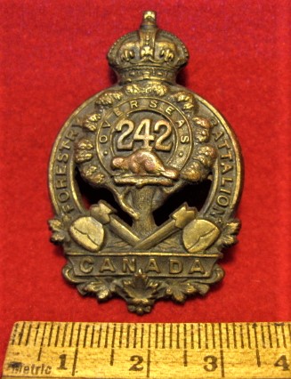 Above are the scans for this CEF 242nd Battalion Cap Badge of the WWI era . Formed in 1916. This badge is complete with both original lug style attachments in good order. A browning brass badge typical of those of its age. A rare find for the discerning collector of Canadian CEF badges.