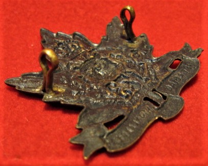 Above are the scans for this CEF 173rd Battalion cap badge. This beautiful badge is complete with both original lugs in good order. Has an unreadable hallmark "Geo...ees" on the top left leaf point. A browning copper o/r badge with very nice patina giving evidence to its age. A beauty for any collector of Canadian CEF badges.