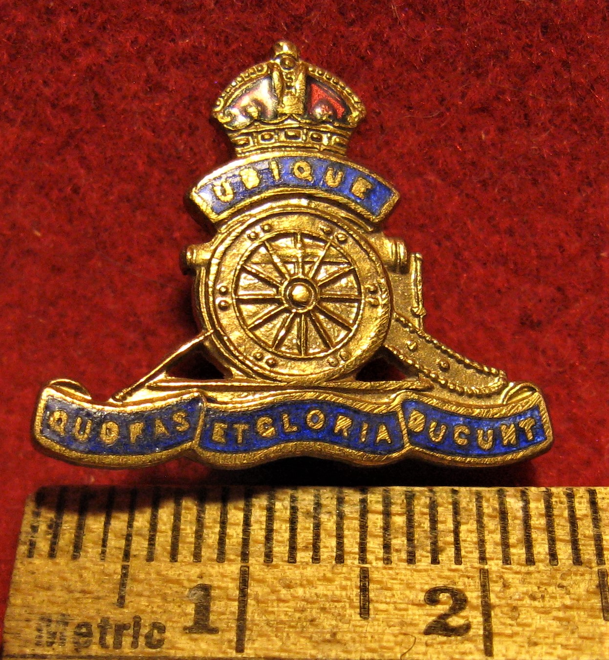 You are viewing the scans for this WWII Field Artillery sweetheart badge. This is a smaller badge (see scans).Note that it has "Ubique" over the cannon, typical of WWII Canadian Artillery emblems. The red and blue enameling is complete and in good order. The badge is made of brass with a straight pin style attachment. (view scans for details)